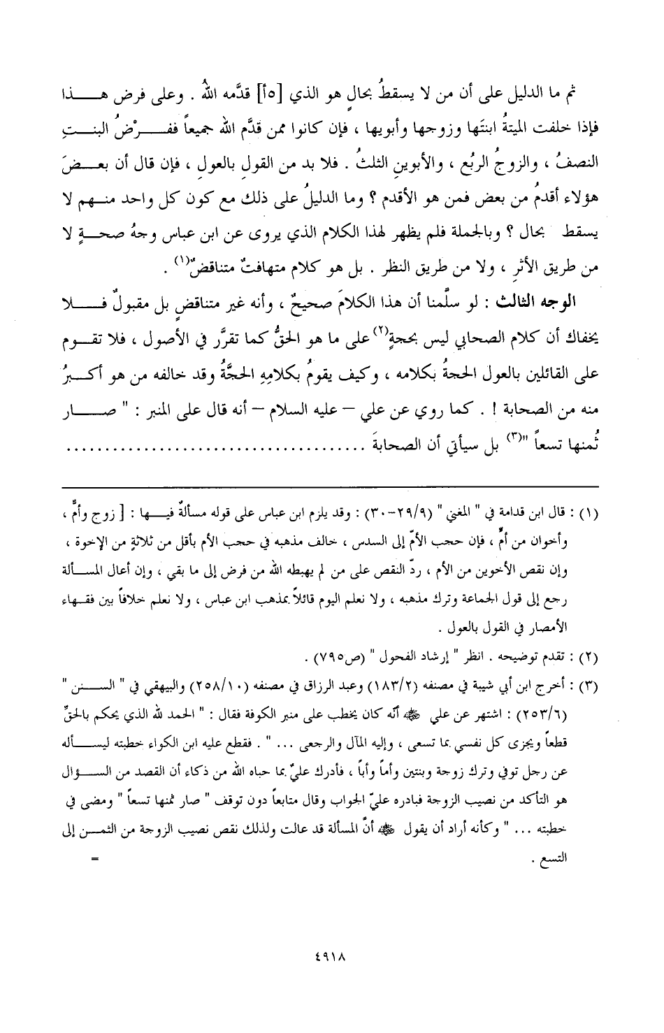 والوجه الثالث: لو سلَّمنا أن هذا الكلامَ صحيحٌ، وأنه غير متناقضٍ بل مقبولٌ فلا يخفاك أن كلام الصحابي ليس بحجةٍ (¬2) على ما هو الحقُّ كما تقرَّر في الأصول فلا تقوم على القائلين بالعول الحجةُ بكلامه، وكيف يقومُ بكلامِهِ الحجَّةُ وقد خالفه من هو أكبرُ منه من الصحابة!. كما روي عن علي- عليه السلام- أنه قال على المنبر: "صار ثُمنها تسعًا" (¬3) بل سيأتي أن الصحابة ..................................
