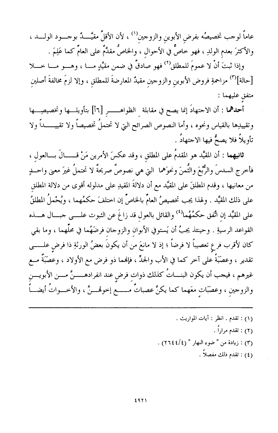 وإذا ثبتَ أنْ لا عمومَ للمطلق (¬2) فهو صادقٌ في ضمن مقيَّدٍ ما، وهو ما خلا [حالة] (¬3) مزاحمةِ فروض الأبوينِ والزوجينِ مقيدٌ المعارضةَ للمطلقِ، وإلا لزمَ مخالفةَ أصلينِ متفقٍ عليهما: