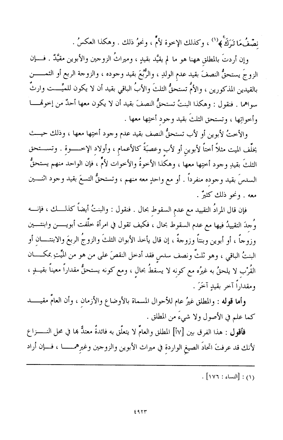 وإن أردتَ بالمطلقِ هاهنا هو ما لم يقيَّد بقيدٍ، وميراثُ الزوجين والأبوين مقيَّدٌ. فإن الزوجَ يستحقُّ النصفَ بقيد عدمِ الولدِ، والرُّبُعَ بقيد وجوده، والزوجة الربع أو الثمن بقيدين المذكورين، والأمُّ تستحقُّ والأبُ الباقي بقيد أن لا يكون للميِّت وارثٌ سواهما. فنقول: وهكذا البنتُ تستحقُّ النصفَ بقيد أن لا يكون معها أحدٌ من إخوتها وأخواتِها، وتستحق الثلثَ بقيد وجودِ أختِها معها.