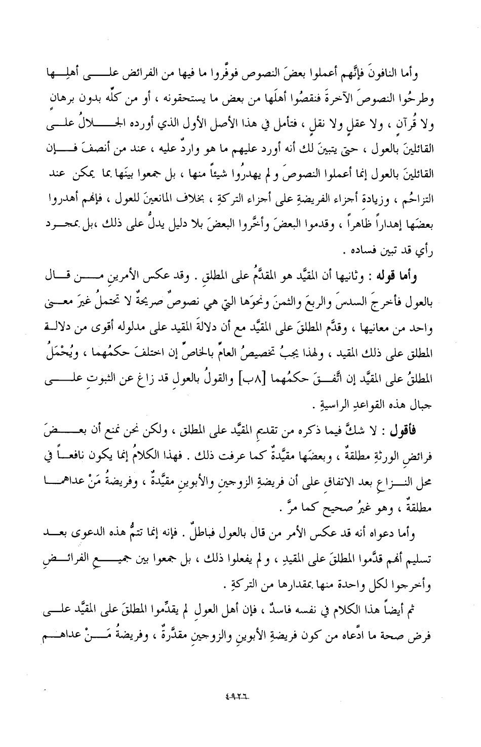 وأما قوله: وثانيها أن المقيَّد هو المقدَّمُ على المطلقِ. وقد عكس الأمرينِ من قال بالعول فأخرجَ السدسَ والربعَ والثمنَ ونحوَها التي هي نصوصٌ صريحةٌ لا تحتملُ غيرَ معنى واحد من معانيها، وقدَّم المطلقَ على المقيَّد مع أن دلالةَ المقيد على مدلوله أقوى من دلالة المطلق على ذلك المقيد، إن اتَّفقَ حكمُهما [8ب] والقولُ بالعولِ قد زاغ عن الثبوتِ على جبال هذه القواعدِ الراسيةِ.