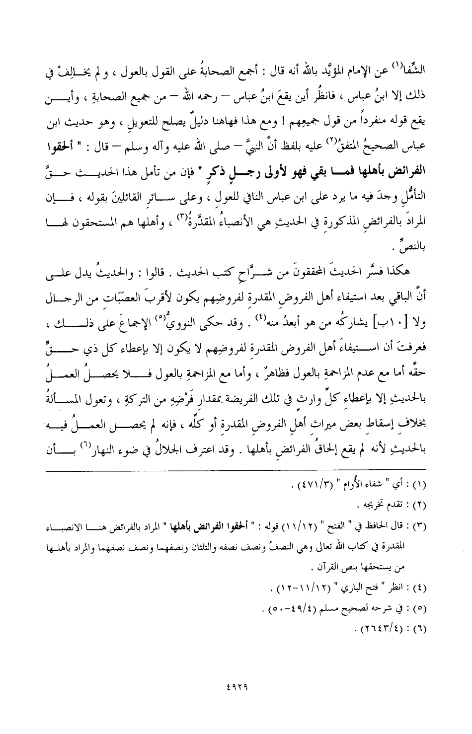 الشِّفا (¬1) عن الإمام المؤيَّد بالله أنه قال: أجمع الصحابةُ على القول بالعول، ولم يخالِفْ في ذلك إلا ابنُ عباس، فانظُر أين يقعَ ابنُ عباس- رحمه الله- من جميع الصحابةِ، وأين يقع قوله منفردًا من قول جميعِهم! ومع هذا فهاهنا دليلٌ يصلح للتعويلِ، وهو حديث ابن عباس الصحيحُ المتفقُ (¬2) عليه بلفظ أنَّ النبي -صَلَّى اللهُ عَلَيْهِ وَسَلَّمَ- قال: "ألحقوا الفرائض بأهلها فما بقي فهو لأول رجلٍ ذكرٍ" فإن من تأمل هذه الحديث حقَّ التأمُّلِ وجدَ فيه ما يرد على ابن عباس النافي للعولِ، وعلى سائرِ القائلينَ بقوله، فإن المرادَ بالفرائضِ المذكورةِ في الحديثِ هي الأنصباءُ المقدَّرةُ (¬3)، وأهلها هم المستحقون لها بالنصِّ.