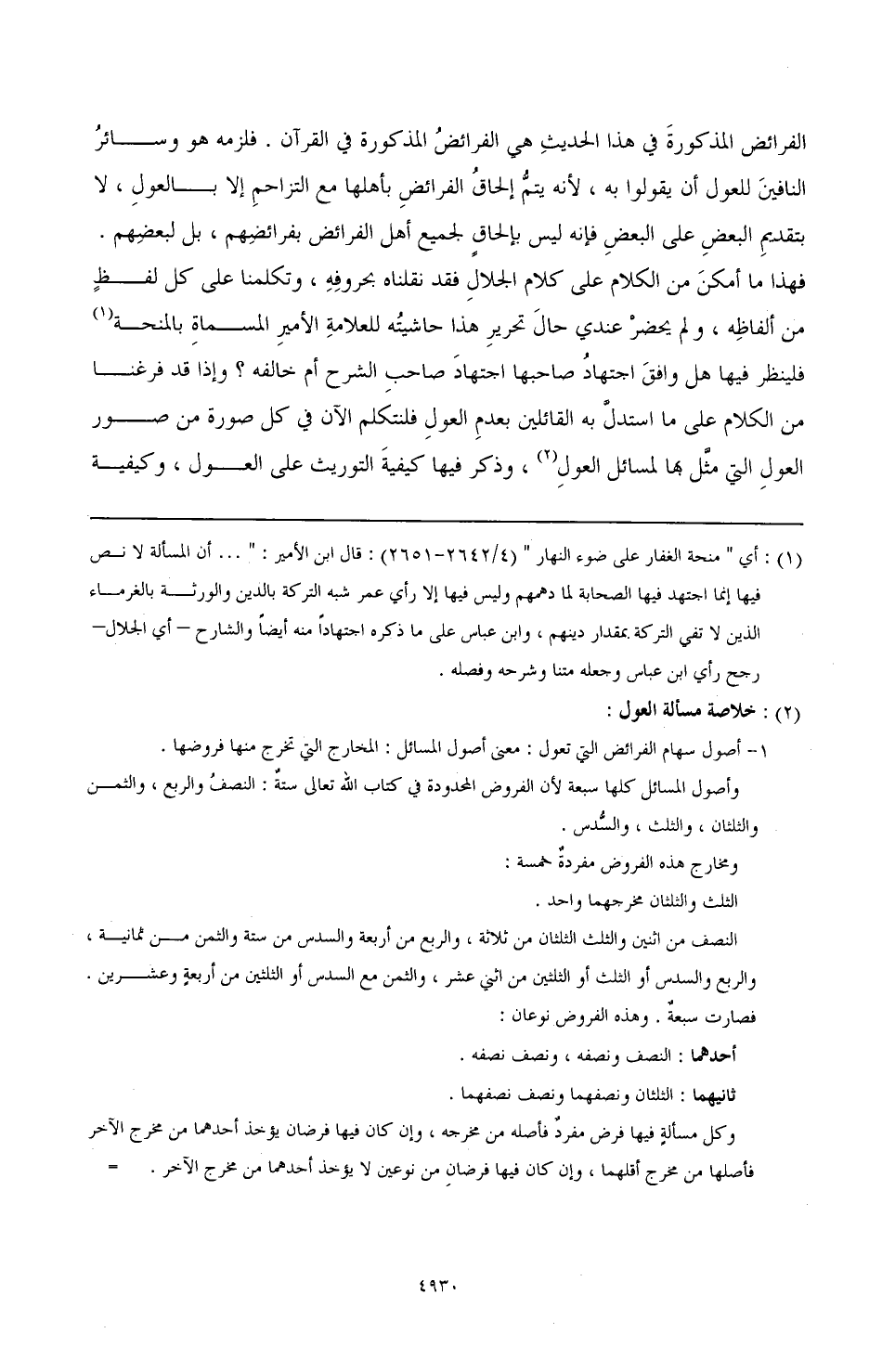(¬1) أي "منحة الغفار على ضوء النهار" (4/ 2642 - 2651): قال ابن الأمير: " ... أن المسألة لا نص فيها إنما اجتهد فيها الصحابة لما دهمهم وليس فيها إلا رأي عمر شبه التركة بالدين والورثة بالغرماء الذين لا تفي التركة بمقدار دينهم، وابن عباس على ما ذكره اجتهادًا منه أيضًا والشارح- أي الجلال- رجح رأي ابن عباس وجعله متنًا وشرحه وفصله.