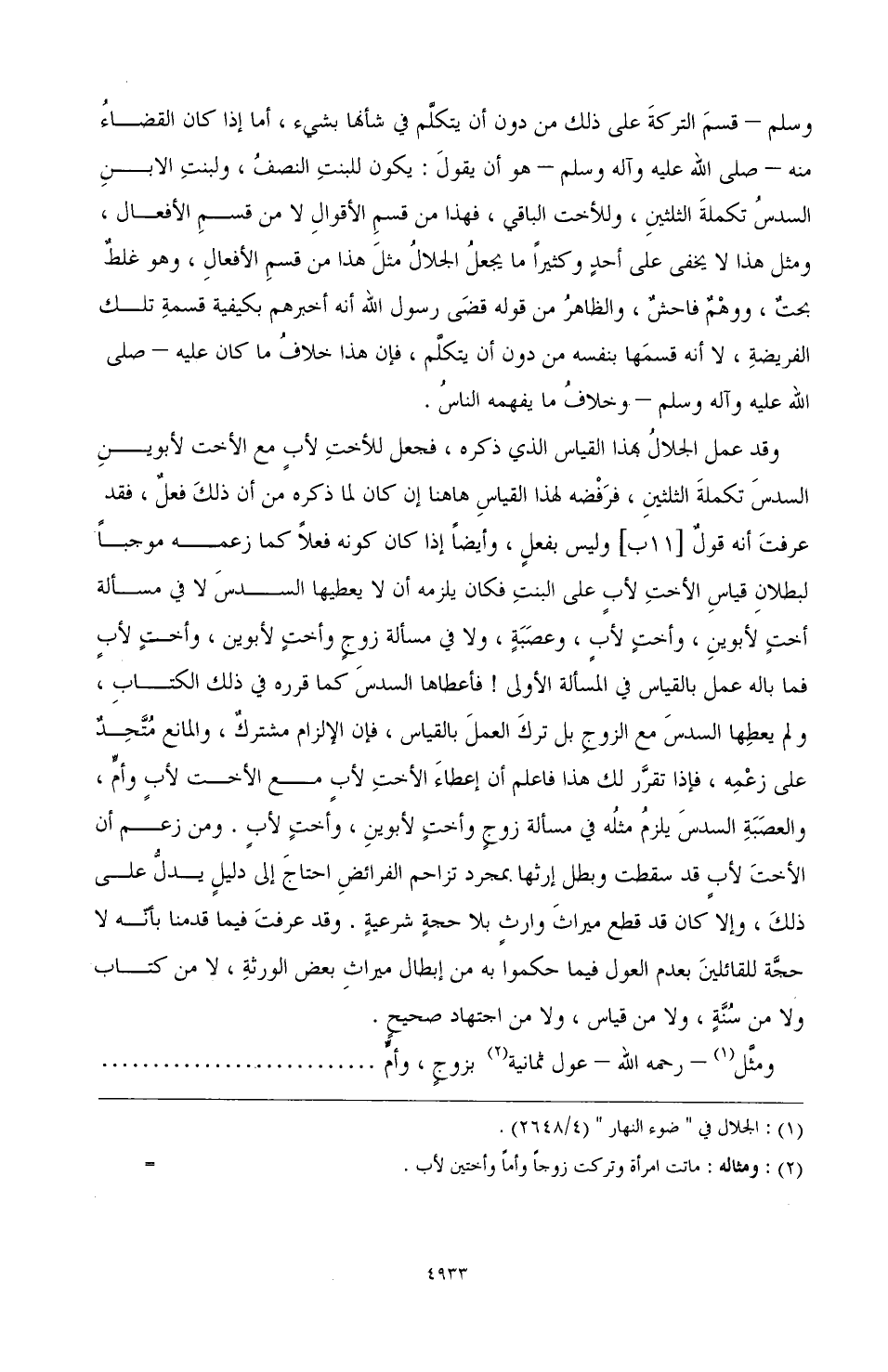 وقد عمل الجلالُ بهذا القياس الذي ذكره، فجعل للأختِ لأبٍ مع الأخت لأبوينِ السدسَ تكملةَ الثلثينِ، فرَفْضه لهذا القياسِ هاهنا إن كان لما ذكره من أن ذلكَ فعلٌ، فقد عرفتَ أنه قولٌ [11ب] وليس بفعلٍ، وأيضًا إذا كان كونه فعلًا كما زعمه موجبًا لبطلانِ قياسِ الأختِ لأبٍ على النبتِ فكان يلزمه أن لا يعطيها السدسَ لا في مسألة أختٍ لأبوينِ، وأختٍ لأبٍ، وعصَبَةٍ، ولا في مسألة زوجٍ وأختٍ لأبوين، وأختٍ لأب فما باله عمل بالقياس في المسألة الأولى! فأعطاها السدس كما قرره في ذلك الكتابِ، ولم يعطِها السدس مع الزوجِ بل تركَ العملَ بالقياس، فإن الإلزام مشتركٌ، والمانع مُتَّحِدٌ على زعْمِه، فإذا تقرَّر لك هذا فاعلم أن إعطاءَ الأختِ لأبٍ مع الأخت لأبٍ وأمٍّ، والعصَبَةِ السدسَ يلزمُ مثلُه في مسألة زوجٍ وأختٍ لأبوينِ، وأختٍ لأبٍ. ومن زعم أن الأختَ لأبٍ قد سقطت وبطل إرثها بمجرد تزاحم الفرائضِ احتاجَ إلى دليلٍ يدلُّ على ذلكَ، وإلا كان قط قطع ميراثَ وارثٍ بل حجةٍ شرعيةٍ. وقد عرفتَ فيما قدمنا بأنَّه لا حجَّة للقائلينَ بعد العول فيما حكموا به من إبطال ميراثِ بعض الورثةِ، لا من كتاب ولا من سُنَّةٍ، ولا من قياس، ولا من اجتهاد صحيح.