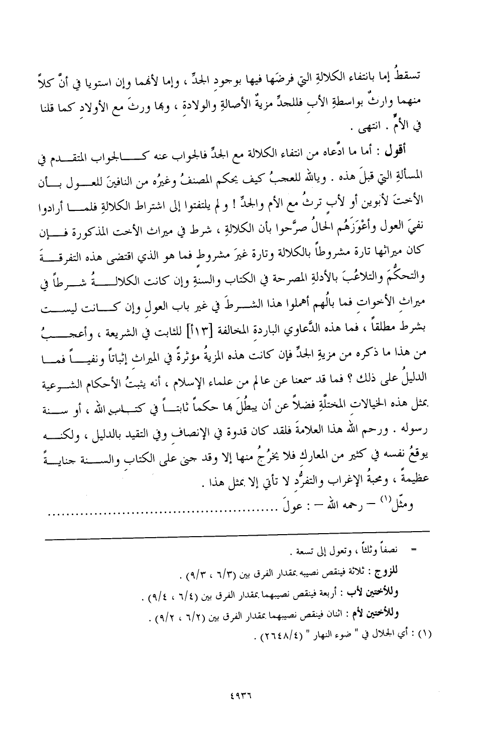 أقول: أما ما ادَّعاه من انتفاء الكلالة مع الجدِّ فالجواب عنه كالجواب المتقدم في المسألةِ التي قبلَ هذه. ويالله للعجبُ كيف يحكم المصنفُ وغيرُه من النافينَ للعول بأن الأختَ لأبوين أو لأبٍ ترثُ مع الأم والجدِّ! ولم يلتفتوا إلى اشتراط الكلالةِ فلما أرادوا نفيَ العول وأعْوَزَهُم الحالُ صرَّحوا بأن الكلالةِ، شرط في ميراث الأخت المذكورة فإن كان ميراثها تارة مشروطًا بالكلالة وتارة غيرَ مشروطٍ فما هو الذي اقتضى هذه التفرقةَ والتحكُّمَ والتلاعُبَ بالأدلةِ المصرحة في الكتاب والسنةِ وإن كانت الكلالةُ شرطًا في ميراثِ الأخواتِ فما بالُهم أهملوا هذا الشرطَ في غير باب العولِ وإن كانت ليست بشرط مطلقًا، فما هذه الدَّعاوي الباردةِ المخالفة [13أ] للثابت في الشريعة، وأعجبُ من هذا ما ذكره من مزيةِ الجدِّ فإن كانت هذه المزيةُ مؤثرةٌ في الميراثِ إثباتًا ونفيًا فما الدليلُ على ذلك؟ فما قد سمعنا عن عالم من علماء الإسلام، أنه يثبتُ الأحكام الشرعية بمثل هذه الخيالاتِ المختلَّةِ فضلًا عن أن يبطُلَ بها حكمًا ثابتًا في كتاب الله، أو سنة رسوله. ورحم الله هذا العلامةَ فلقد كان قدوة في الإنصافِ وفي التقيد بالدليل، ولكنه يوقعُ نفسه في كثير من المعاركِ فلا يخرُجُ منها إلا وقد جنى على الكتابِ والسنة جنايةً عظيمةً، ومحبةُ الإغراب والتفرُّدِ لا تأتي إلا بمثل هذا.