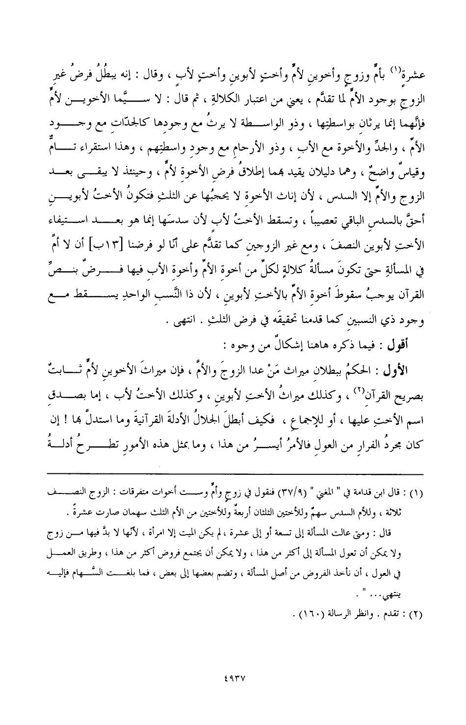 الأول: الحكمُ ببطلانِ ميراث مَنْ عدا الزوجَ والأمَّ، فإن ميراثَ الأخوينِ لأمٍّ ثابتٌ بصريح القرآنِ (¬2)، وكذلك ميراثُ الأختِ لأبوينِ، وكذا الأختُ لأب، إما بصدقِ اسم الأختِ عليها، أو للإجماعِ، فكيف أبطلَ الجلالُ الأدلةَ القرآنيةَ وما استدلَّ بها! إن كان مجردُ الفرارِ من العولِ فالأمرُ أيسرُ من هذا، وما بمثل هذه الأمورِ تطرحُ أدلةُ
