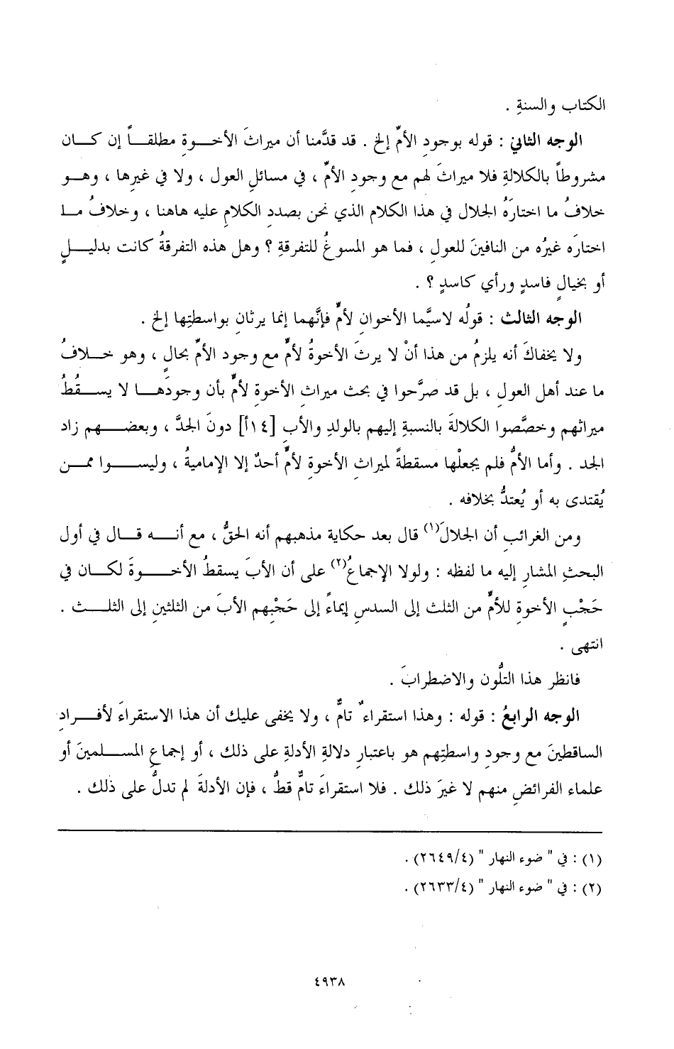 والوجه الرابعُ: قوله: وهذا استقراءٌ تامٌّ، ولا يخفى عليك أن هذا الاستقراءَ لأفرادِ الساقطينَ مع وجودِ واسطتِهم هو باعتبارِ دلالةِ الأدلةِ على ذلك، أو إجماعِ المسلمينَ أو علماء الفرائضِ منهم لا غيرَ ذلك. فلا استقراءَ تامٌّ قطُّ، فإن الأدلةَ لم تدلُّ على ذلك.