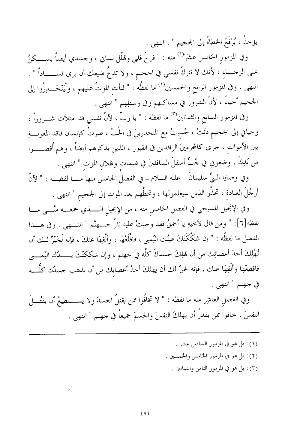 وفي المزمور الخامس عشر (¬1) منه: "فرح قلبي وتهلل لمساني، وجسدي أيضًا يسكن على الرجاء، لأنك لا تترك نفسي في الجحيم، ولا تدع ضيفك أن يرى فسادا". انتهى. وفي المزمور الرابع والخمسين (¬2) ما لفظه: "ليأت الموت عليهم، ولينحدروا إلى الجحيم أحياء، لأن الشرور في مساكنهم وفي وسطهم" انتهى.