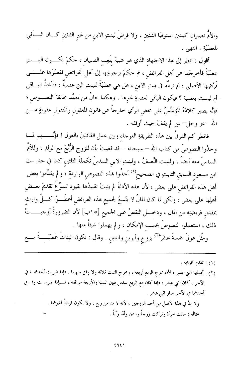 أقول: انظر إلى هذا الاجتهادِ الذي هو شبيهٌ بِلَعبِِ الصبيانِ، حكمَ بكون البنتِ عصَبَةً فأخرجَها عن أهل الفرائضِ، ثم حكمَ برجوعِها إلى أهل الفرائضِ فقصَرَها على فَرْضِها الأصلي، ثم تردَّد في بنتِ الابنِ، هل هي عصَبَةٌ للبنتِ التي عصبةٌ، فتأخذُ الباقي أم ليست بعصبة؟ فيكون الباقي لعصبةِ غيرِها. وهكذا حالت من تعمَّد مخالفةَ النصوصِ؛ فإنَّه يصير كلامُهُ المؤسَّسُ على محضِ الرأي خالصا عن قانونِ المعقولِ والمنقولِ عقوبةٍ من الله- عز وجل- لمن لم يقفْ حيث أوقفه.