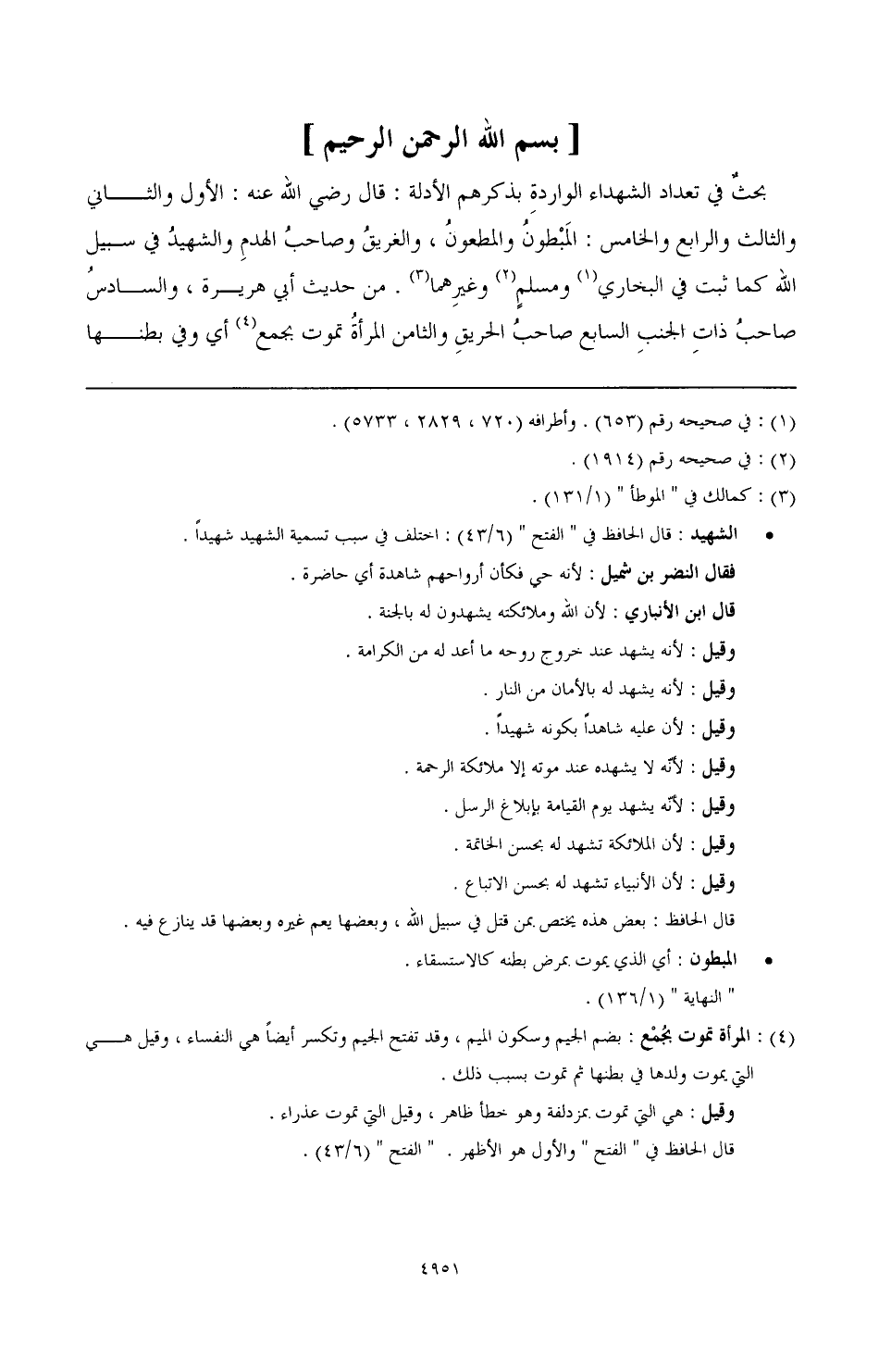 بحثٌ في تعداد الشهداء الواردةِ بذكرهم الأدلة: قال رضي الله عنه: الأول والثاني والثالث والرابع والخامس: المَبْطونُ والمطعونُ، والغريقُ وصاحبُ الهدمِ والشهيدُ في سبيل الله كما ثبت في البخاري (¬1) ومسلم (¬2) وغيرِهما (¬3). من حديث أبي هريرة، والسادس: ُ صاحبُ ذاتِ الجنبِ.