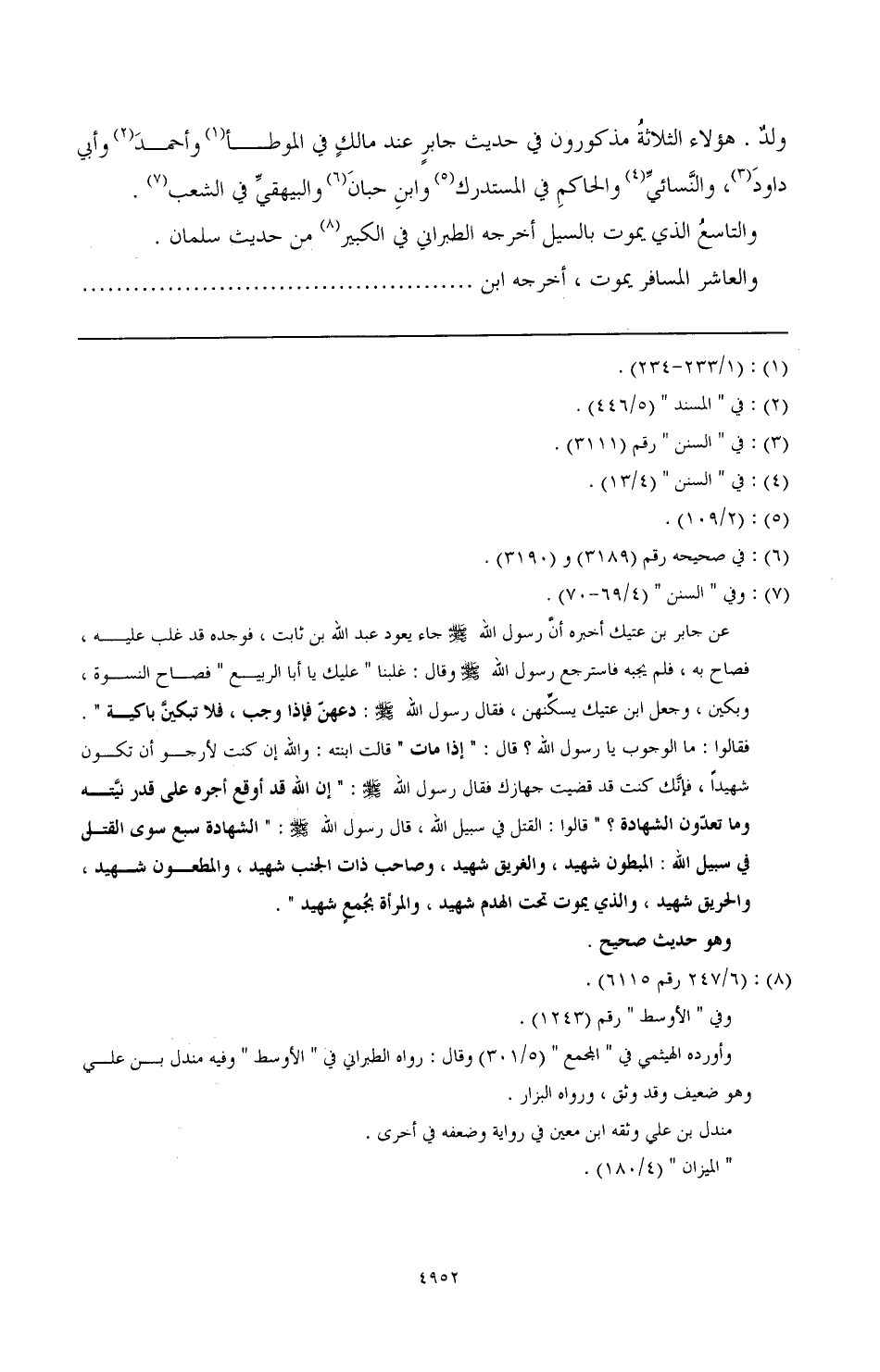 عن جابر بن عتيك أخبره أنَّ رسول الله صَلَّى اللهُ عَلَيْهِ وَسَلَّمَ جاء يعود عبد الله بن ثابت، فوجده قد غلب عليه، فصاح به، فلم يجبه فاسترجع رسول الله صَلَّى اللهُ عَلَيْهِ وَسَلَّمَ وقال: "غلبنا عليك يا أبا الربيع" فصاح النسوة، وبكين، وجعل ابن عتيك يسكِّنهن، فقال رسول الله صَلَّى اللهُ عَلَيْهِ وَسَلَّمَ: "دعهن فإذا وجب، فلا تبكينَّ باكية". فقالوا: ما الوجوب يا رسول الله؟ قال: "إذا مات" قالت ابنته: والله إن كنت لأرجو أن تكون شهيدًا، فإنَّك كنت قد قضيت جهازك فقال رسول الله صَلَّى اللهُ عَلَيْهِ وَسَلَّمَ: "إن الله قد أوقع أجره على قدر نيَّته وما تعدّون الشهادة؟ " قالوا: القتل في سبيل الله، قال رسول الله صَلَّى اللهُ عَلَيْهِ وَسَلَّمَ: "الشهادة سبع سوى القتل في سبيل الله: المبطون شهيد، والغريق شهيد، وصاحب ذات الجنب شهيد، والمطعون شهيد، والحريق شهيد، والذي يموت تحت الهدم شهيد، والمرأة بجُمعٍ شهيد".