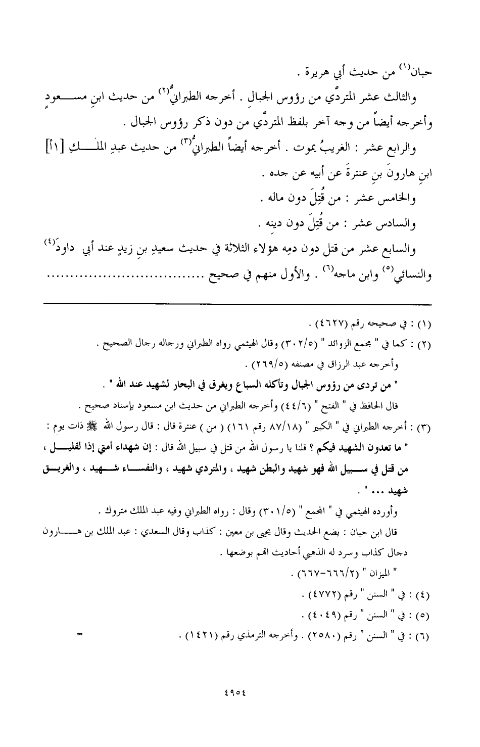 والسابع عشر: من قتل دون دمِه، هؤلاء الثلاثة في حديث سعيدٍ بنِ زيدٍ عند أبي داودَ (¬4) والنسائي (¬5) وابن ماجه (¬6). والأول منهم في صحيح .................................