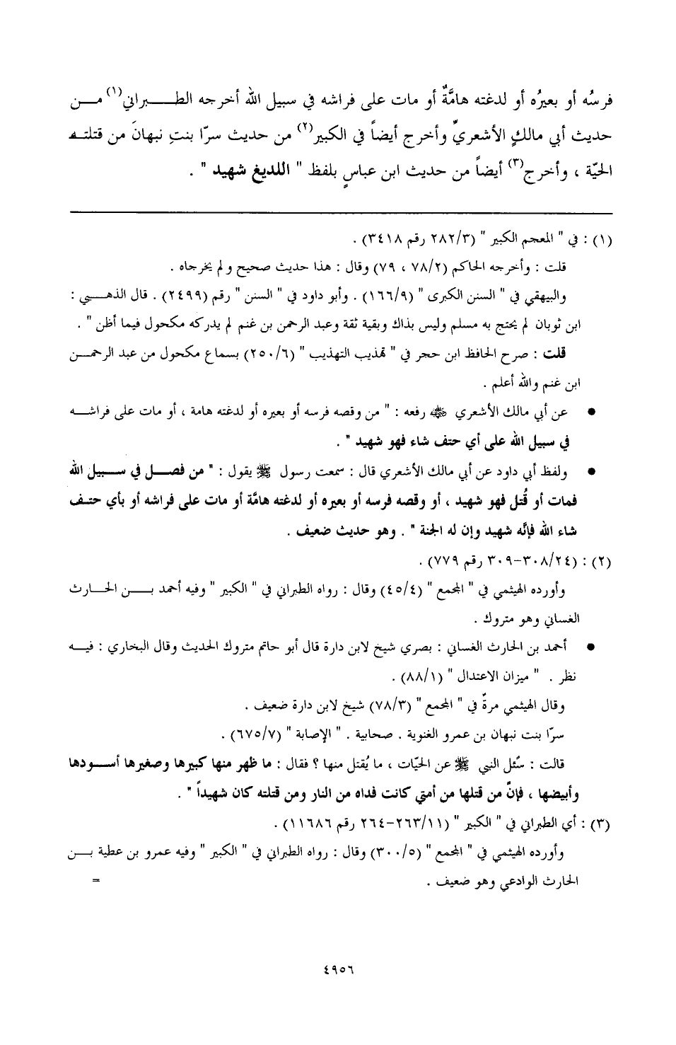عن أبي مالك الأشعري -رضي الله عنه- رفعه: "من وقصه فرسه أو بعيره أو لدغته هامة، أو مات على فراشه في سبيل الله على أي حتف شاء فهو شهيد".