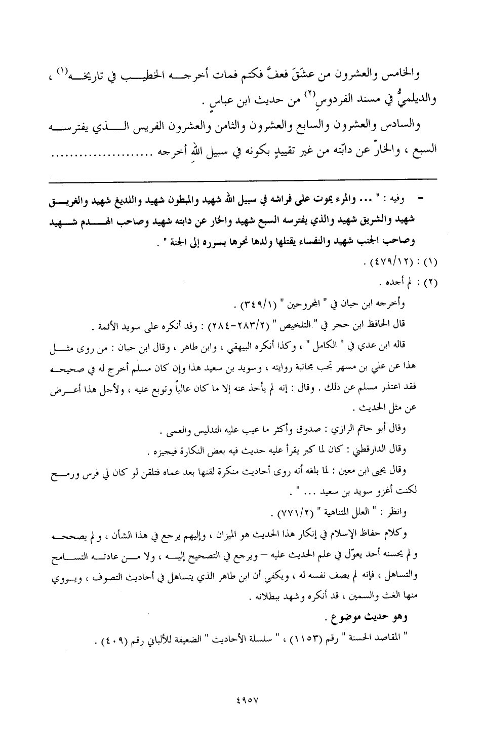 قاله ابن عدي في "الكامل"، وكذا أنكره البيهقي، وابن طاهر، وقال ابن حبان: من روى مثل هذا عن علي بن مسهر تجب مجانبة روايته، وسويد بن سعيد هذا وإن كان مسلم أخرج له في صحيحه فقد اعتذر مسلم عن ذلك. وقال: إنه لم يأخذ عنه إلا ما كان عاليًا وتوبع عليه، ولأجل هذا أعرض عن مثل الحديث.