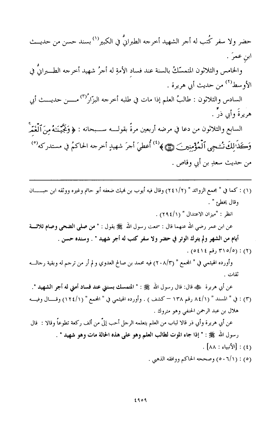 والخامس والثلاثون: المتمسّكُ بالسنة عند فسادِ الأمةِ له أجرُ شهيد. أخرجه الطبرانيُّ في الأوسط (¬2) من حديث أبي هريرة.