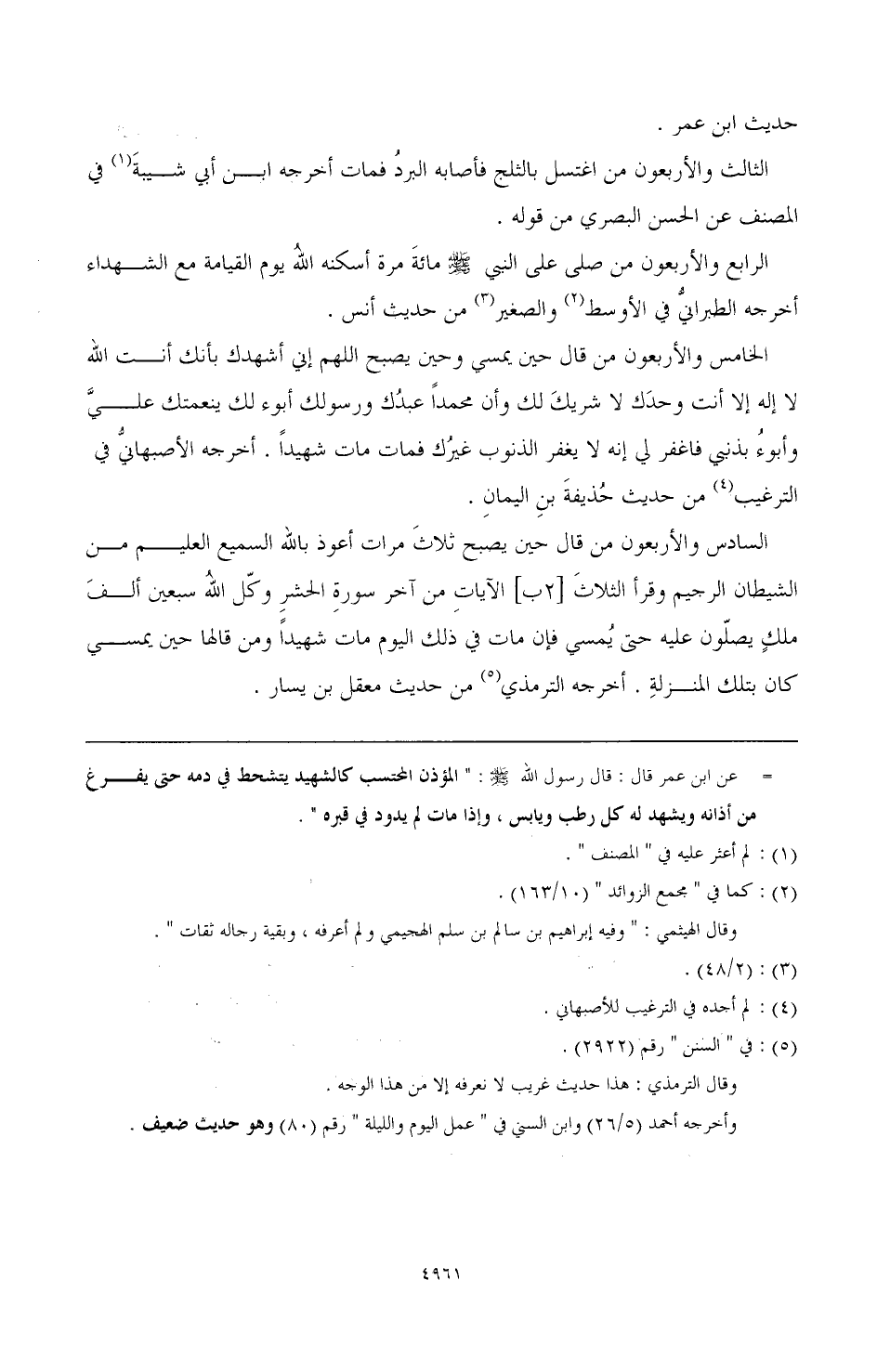 الخامس والأربعون: من قال حين يمسي وحين يصبح اللهم إني أشهدك بأنك أنت الله لا إله إلا أنت وحدكَ لا شريكَ لك وأن محمدًا عبدُك ورسولك أبوء لك بنعمتك عليَّ وأبوءُ بذنبي فاغفر لي إنه لا يغفر الذنوب غيرُك فمات مات شهيدًا. أخرجه الأصبهانيُّ في الترغيب (¬4) من حديث حُذيفةَ بنِ اليمانِ.
