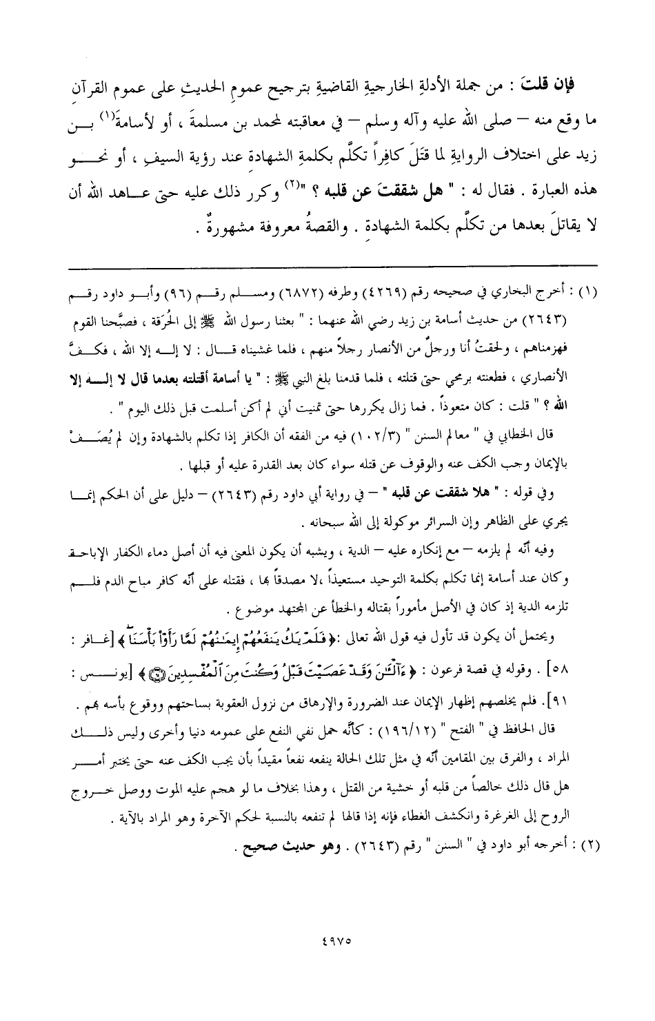 فإن قلت: من جملة الأدلة الخارجية القاضيةِ بترجيح عمومِ الحديثِ على عموم القرآنِ ما وقع منه -صَلَّى اللهُ عَلَيْهِ وَسَلَّمَ- في معاقبته لمحمد بن مسلمةَ، أو لأسامةَ (¬1) بن زيد على اختلاف الرواية لما قتَلَ كافِرًا تكلَّم بكلمة الشهادةِ عند رؤية السيفِ، أو نحو هذه العبارة. فقال له: "هل شققتَ عن قلبه" (¬2) وكرر ذلك عليه حتى عاهد الله أن لا يقاتلَ بعدها من تكلَّم بكلمة الشهادةِ. والقصةُ معروفة مشهورةٌ.