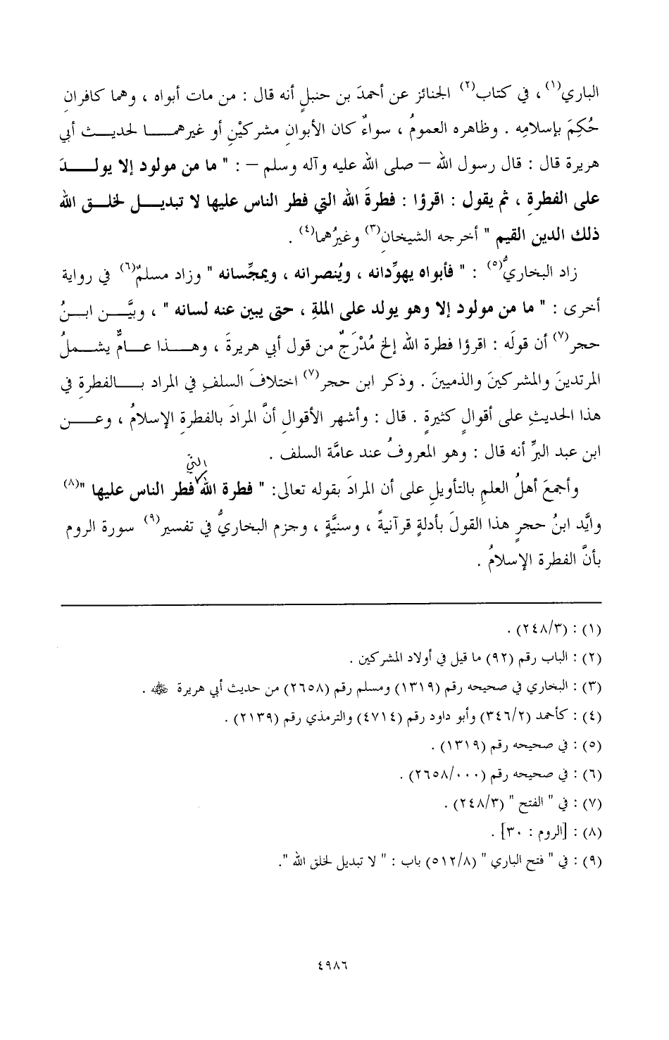 وأجمع أهل العلم بالتأويل على أن المراد بقوله تعالى:} فِطْرَةَ اللَّهِ الَّتِي فَطَرَ النَّاسَ عَلَيْهَا {(¬9) وأيد ابن حجر هذا القول بأدلة قرآنية، وسنية، وجزم البخاري في تفسير (¬10) سورة الروم بأن الفطرة الإسلام.
