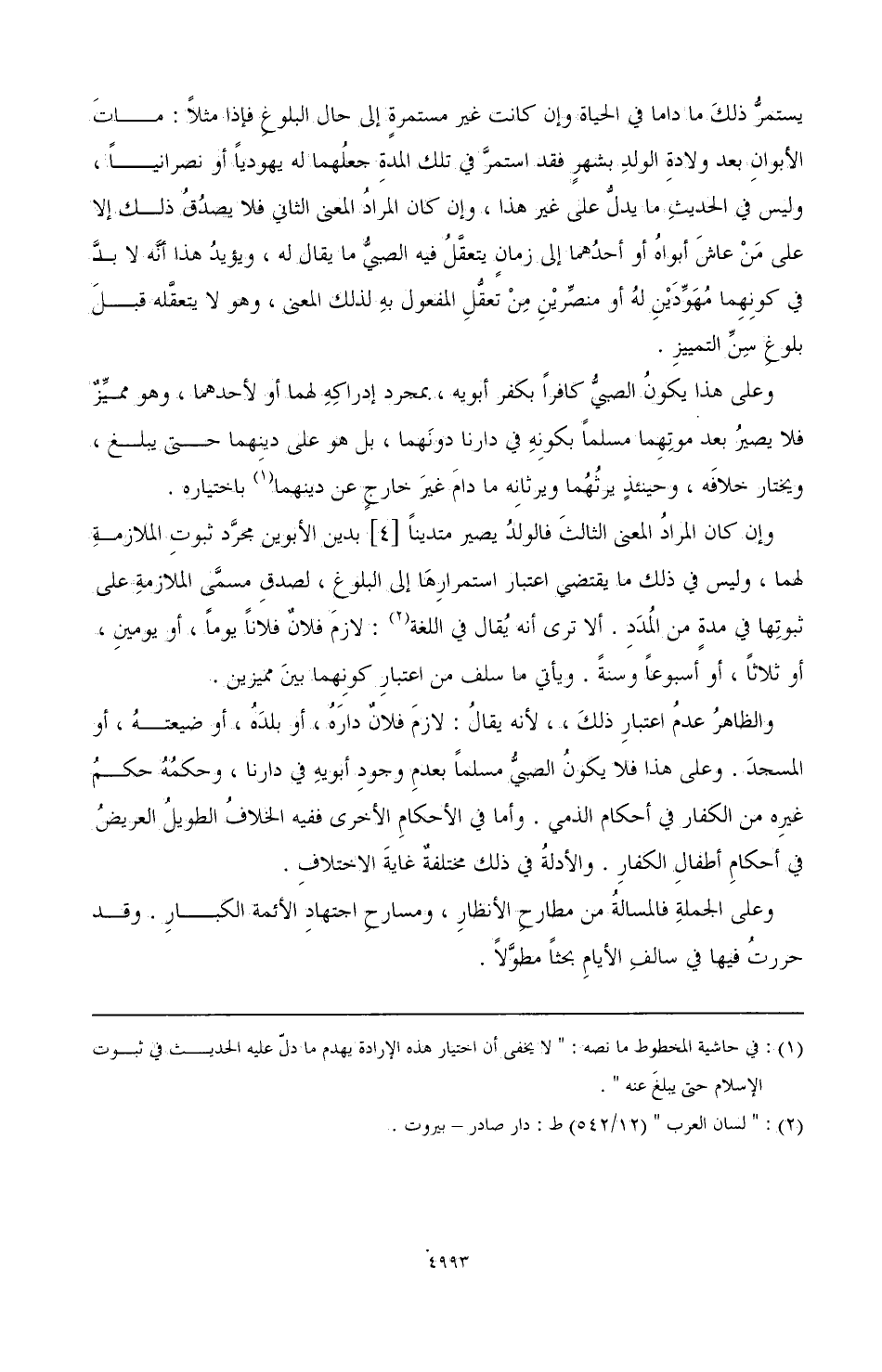 وإن كان المراد المعنى الثالث فالولد يصير متدينًا [4] بدين الأبوين مجرد ثبوت الملازمة لهما، وليس في ذلك ما يقتضي اعتبار استمرارها إلى البلوغ، لصدق مسمى الملازمة على ثبوتها في مدة من المدد. ألا ترى أنه يقال في اللغة (¬2): لازم فلانًا يومًا، أو يومين، أو ثلاثًا، أو أسبوعًا وسنة. ويأتي ما سلف من اعتبار كونهما بين مميزين.