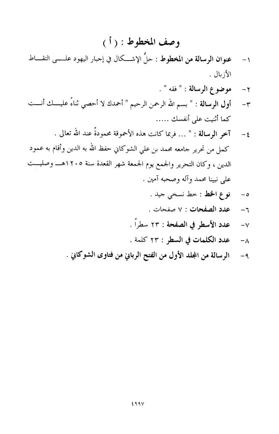 9 - الرسالة من المجلد الأول من الفتح الرباني من فتاوى الشوكاني.