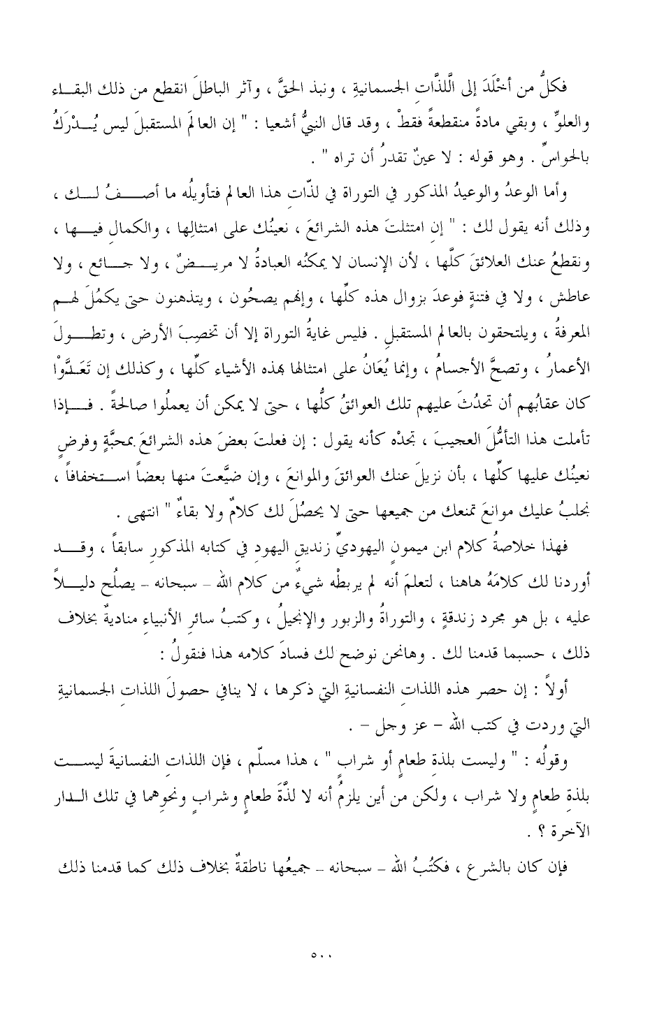 فهذا خلاصة كلام ابن ميمون اليهودي زنديق اليهود في كتابه المذكور سابقا، وقد أوردنا لك كلامه هاهنا، لتعلم أنه لم يربطه شيء من كلام الله -سبحانه- يصلح دليلا عليه، بل هو مجرد زندقة، والتوراة والزبور والإنجيل، وكتب سائر الأنبياء منادية بخلاف ذلك، حسبما قدمنا لك. وها نحن نوضح لك فساد كلامه هذا فنقول: