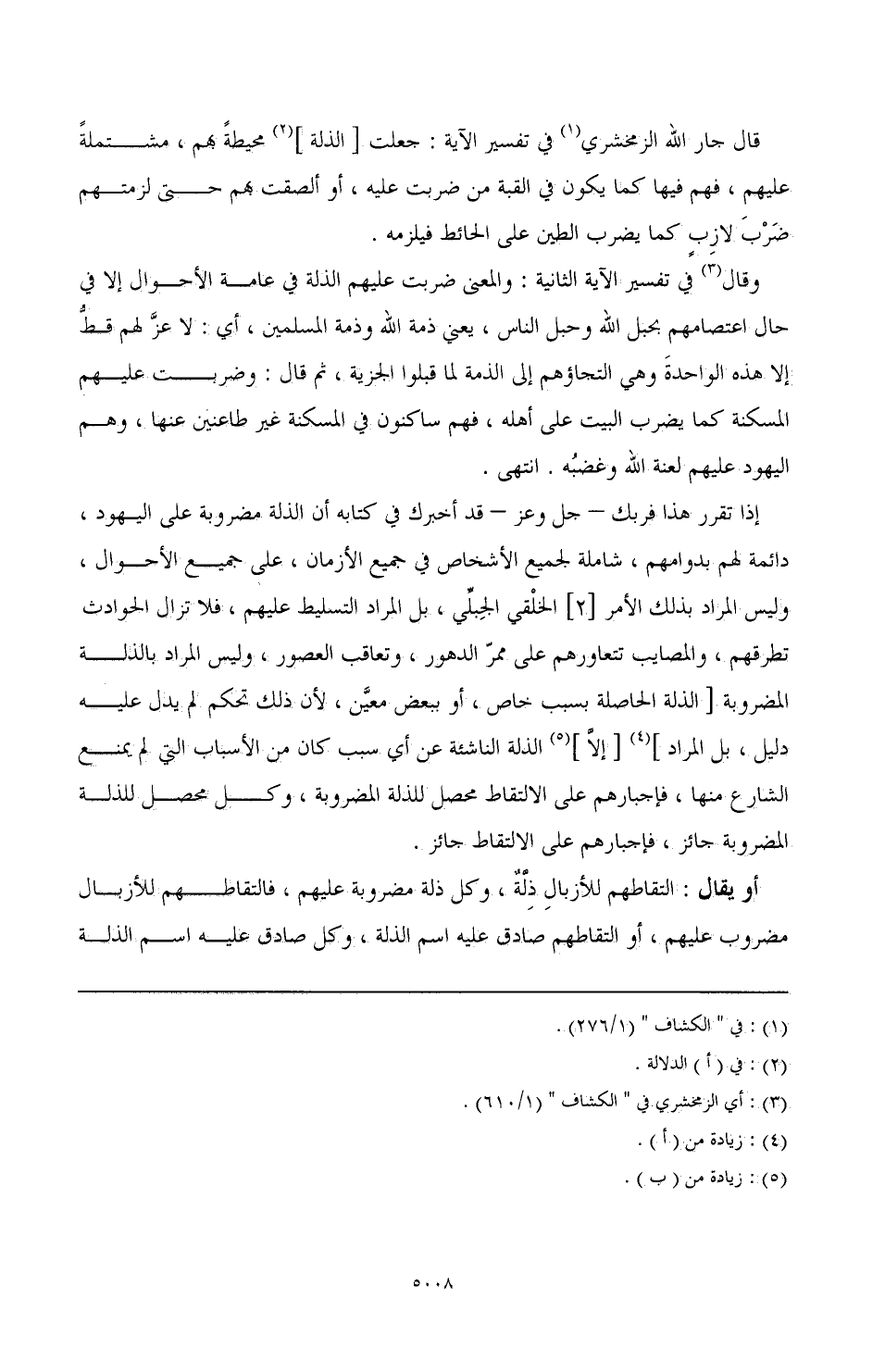 إذا تقرر هذا فربك - جل وعز- قد أخبرك في كتابه أن الذلة مضروبة على اليهود، دائمة لهم بدوامهم، شاملة لجميع الأشخاص في جميع الأزمان، على جميع الأحوال، وليس المراد بذلك الأمر [2] الخلقي الجبلي، بل المراد التسليط عليهم، فلا تزال الحوادث تطرقهم، والمصايب تتعاورهم على ممر الدهور، وتعاقب العصور، وليس المراد بالذلة المضروبة [الذلة الحاصلة بسبب خاص، أو ببعض معين؛ لأن ذلك تحكم لم يدل عليه دليل، بل المراد] (¬4) [إلا] (¬5) الذلة الناشئة عن أي سبب كان من الأسباب التي لم يمنع الشارع منها، فإجبارهم على الالتقاط محصل للذلة المضروبة، وكل محصل للذلة المضروبة جائز، فإجبارهم على الالتقاط جائز.