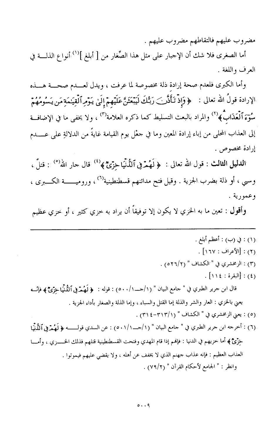 الدليل الثالث: قول الله تعالى:} لهم في الدنيا خزي {(¬4) قال جار الله (¬5): قتل، وسبي، أو ذلة بضرب الجزية. وقيل فتح مدائنهم قسطنطينية (¬6)، ورومية الكبرى، وعمورية.
