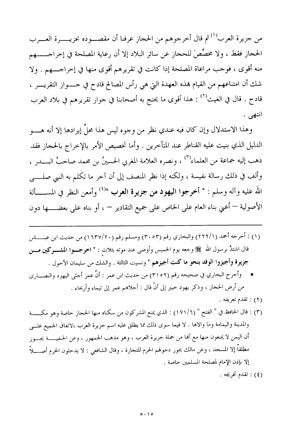 وهذا الاستدلال وإن كان فيه عندي نظر من وجوه ليس هذا محل إيرادها إلا أنه هو الدليل الذي بنيت عليه القناطر عند المتأخرين. وأما تخصيص الأمر بالإخراج بالحجاز فقد ذهب إليه جماعة من العلماء (¬3)، ونصره العلامة المغربي الحسين بن محمد صاحب البدر، وألف في ذلك رسالة نفيسة، ولكنه إذا نظر المنصف إلى أن آخر ما تكلم به النبي - صَلَّى اللهُ عَلَيْهِ وَآلِهِ وَسَلَّمَ-: "أخرجوا اليهود من جزيرة العرب" (¬4) وأمعن النظر في المسألة الأصولية - أعني بناء العام على الخاص على جميع التقادير-، أو بناه على بعضها دون