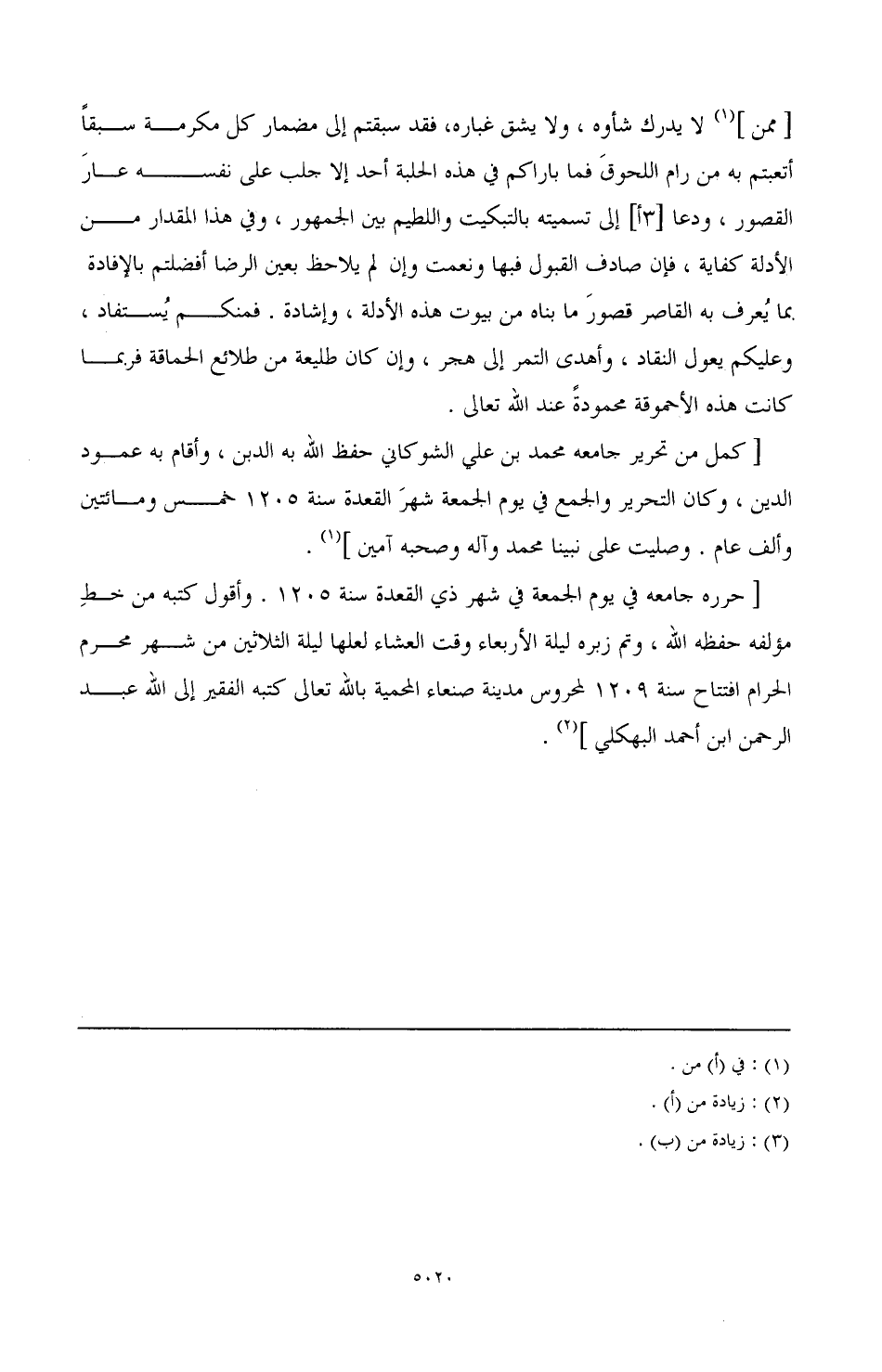 [حرره جامعه في يوم الجمعة في شهر ذي القعدة سنة 1205. وأقول كتبه من خط مؤلفه حفظه الله، وتم زبره ليلة الأربعاء وقت العشاء لعلها ليلة الثلاثين من شهر محرم الحرام افتتاح سنة 1209 لمحروس مدينة صنعاء المحمية بالله تعالى كتبه الفقير إلى الله عبد الرحمن بن أحمد البهكلي] (¬3).
