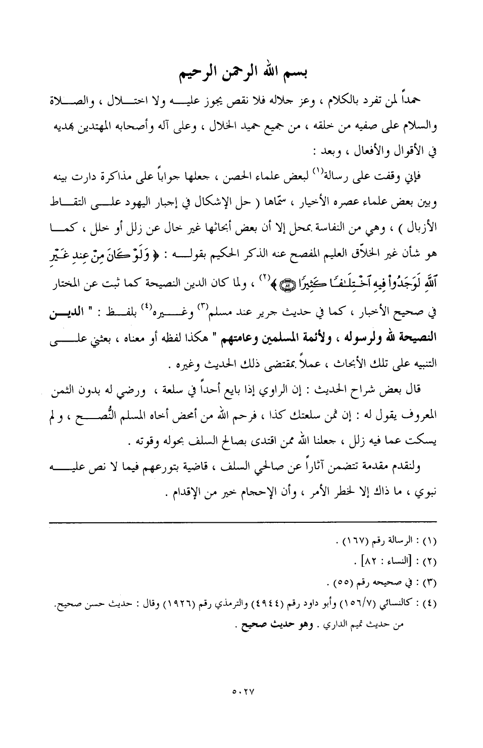 فإني وقفت على رسالة (¬1) لبعض علماء الحصن، جعلها جوابًا على مذاكرة دارت بينه وبين بعض علماء عصره الأخيار، سماها (حل الإشكال في إجبار اليهود على التقاط الأزبال)، وهي من النفاسة بمحل إلا أن بعض أبحاثها غير خال عن زلل أو خلل، كما هو شأن غير الخلاق العليم المفصح عنه الذكر الحكيم بقوله: {ولو كان من عند غير الله لوجدوا فيه اختلافًا كثيرًا} (¬2)، ولما كان الدين النصيحة كما ثبت عن المختار في صحيح الأخبار، كما في حديث جرير عند مسلم (¬3) وغيره (¬4) بلفظ: "الدين النصيحة لله ولرسوله، ولأئمة المسلمين وعامتهم" هكذا لفظه أو معناه، بعثني على التنبيه على تلك الأبحاث، عملًا بمقتضى ذلك الحديث وغيره.