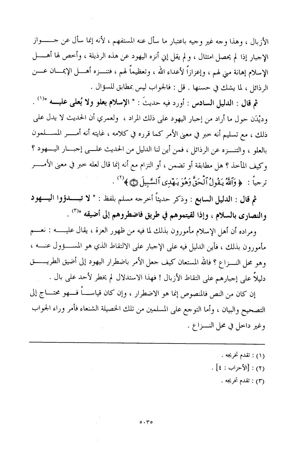 ثم قال: الدليل السابع: وذكر حديثًا أخرجه مسلم بلفظ: "لا تبدءوا اليهود والنصارى بالسلام، وإذا لقيتموهم في طريق فاضطروهم إلى أضيقه" (¬3).