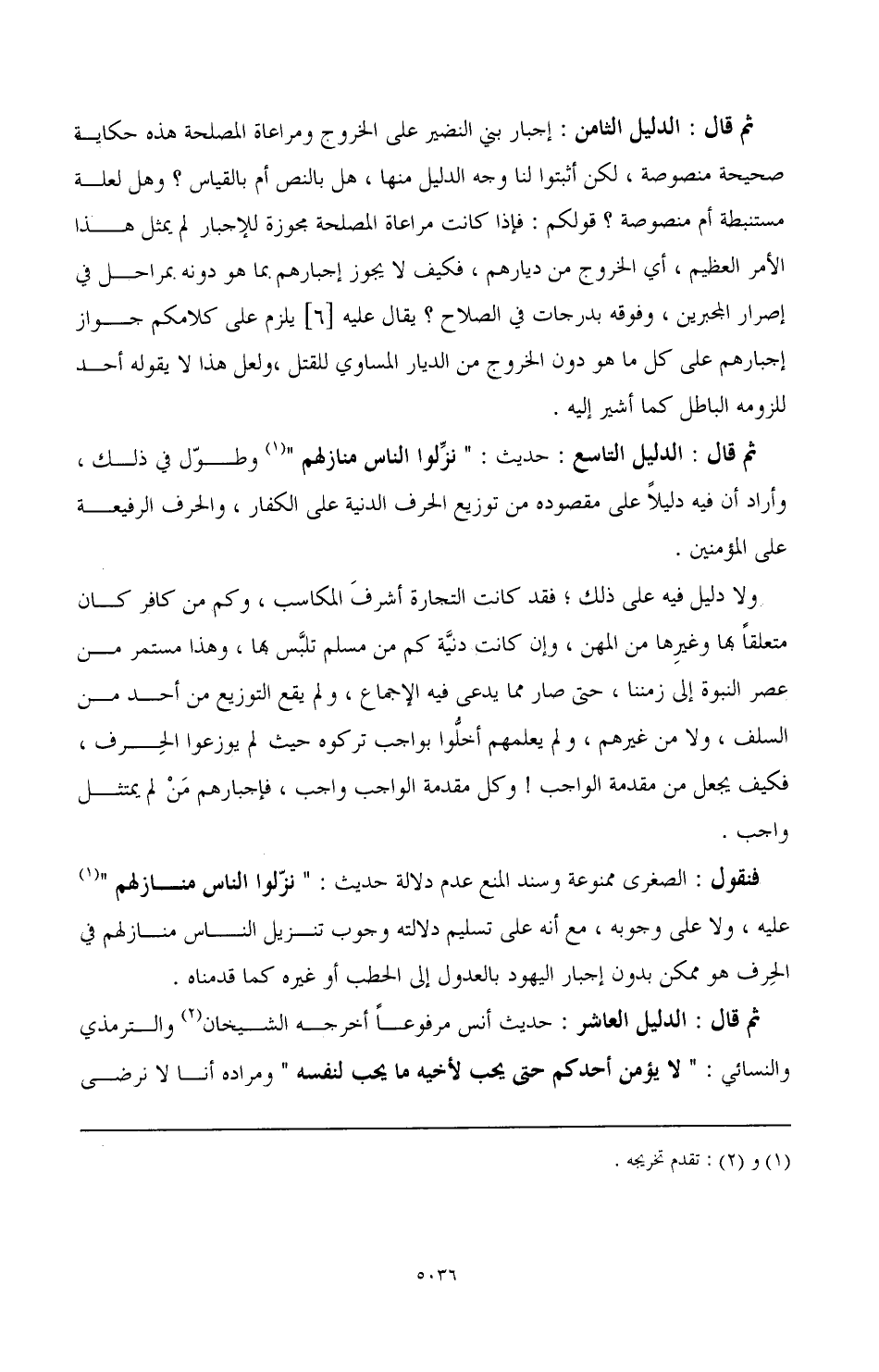 ثم قال: الدليل الثامن: إجبار بني النضير على الخروج ومراعاة المصلحة هذه حكاية صحيحة منصوصة، لكن أثبتوا لنا وجه الدليل منها، هل بالنص أم بالقياس؟ وهل لعلة مستنبطة أم منصوصة؟ قولكم: فإذا كانت مراعاة المصلحة مجوزة للإجبار لم يمثل هذا الأمر العظيم أي الخروج من ديارهم فكيف لا يجوز إجبارهم بما هو دونه بمراحل في إصرار المجبرين، وفوقه بدرجات في الصلاح؟ يقال عليه [6] يلزم على كلامكم جواز إجبارهم على كل ما هو دون الخروج من الديار المساوي للقتل، ولعل هذا لا يقوله أحد للزومه الباطل كما أشير إليه.