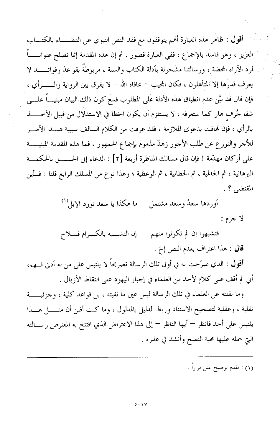 أقول: ظاهر هذه العبارة أنهم يتوقفون مع فقد النص النبوي عن القضاء بالكتاب العزيز، وهو فاسد بالإجماع، ففي العبارة قصور. ثم إن هذه المقدمة إنما تصلح عنوانًا لرد الآراء المحضة، ورسالتنا مشحونة بأدلة الكتاب والسنة، مربوطة بقواعد وفوائد لا يعرف قدرها إلا المتأهلون، فكان المجيب - عافاه الله - لا يفرق بين الرواية والرأي، فإن قال: قد بين عدم انطباق هذه الأدلة على المطلوب فمع كون ذلك البيان مبنيًّا على شفا جرف هار كما ستعرفه، لا يستلزم أن يكون الخطأ في الاستدلال من قبيل الأخذ بالرأي، فإن تهافت بدعوى الملازمة، فقد عرفت من الكلام السالف سببية هذا الأمر للأجر والتورع عن طلب الأجور زهد مذموم بإجماع الجمهور، فما هذه المقدمة المبنية على أركان مهدمة! فإن قال مسالك المناظرة أربعة [2]: الدعاء إلى الحق بالحكمة البرهانية، ثم الجدلية، ثم الخطابية، ثم الوعظية؛ وهذا نوع من المسلك الرابع قلنا: فأين المقتضى؟.
