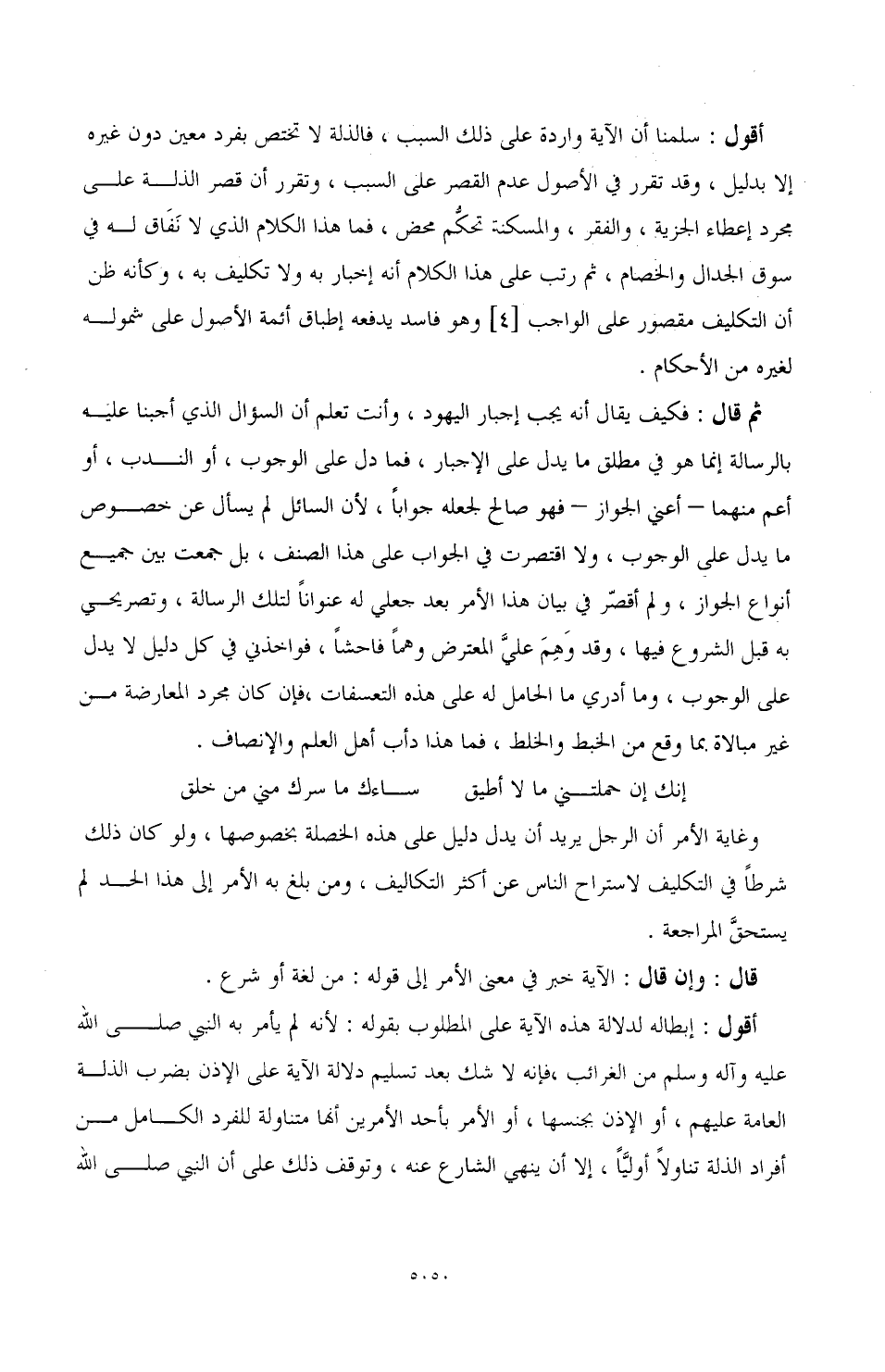 أقول: سلمنا أن الآية واردة على ذلك السبب، فالذلة لا تختص بفرد معين دون غيره إلا بدليل، وقد تقرر في الأصول عدم القصر على السبب، وتقرر أن قصر الذلة على مجرد إعطاء الجزية، والفقر، والمسكنة تحكم محض، فما هذا الكلام الذي لا نفاق له في سوق الجدال والخصام، ثم رتب على هذا الكلام أنه إخبار به ولا تكليف به، وكأنه ظن أن التكليف مقصور على الواجب [4] وهو فاسد يدفعه إطباق أئمة الأصول على شموله لغيره من الأحكام.