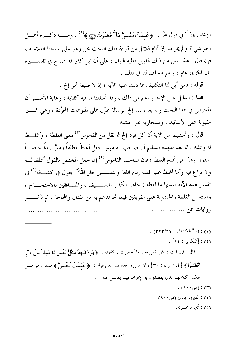 قال: وأستنبط من الآية أن كل فرد إلخ ثم نقل من القاموس (¬3) معنى الغلظة، وأغلظ له وعليه، ثم نعم لفهمه السليم أن صاحب القاموس جعل أغلظ مطلقًا ومقيدًا خاصًَّا بالقول وهذا من أقبح الغلظ؛ فإن صاحب القاموس (¬4) إنما جعل المختص بالقول أغلظ له ولا نزاع فيه، وأما أغلظ عليه فهذا إمام اللغة والتفسير جار الله (¬5) يقول في كشافه (¬6) في تفسير هذه الآية نفسها ما لفظه: جاهد الكفار بالسيف، والمنافقين بالاحتجاج، واستعمل الغلظة والخشونة على الفريقين فيما تجاهدهم به من القتال والمحاجة، ثم ذكر روايات عن. . . . . . . . . . . . . . . . .