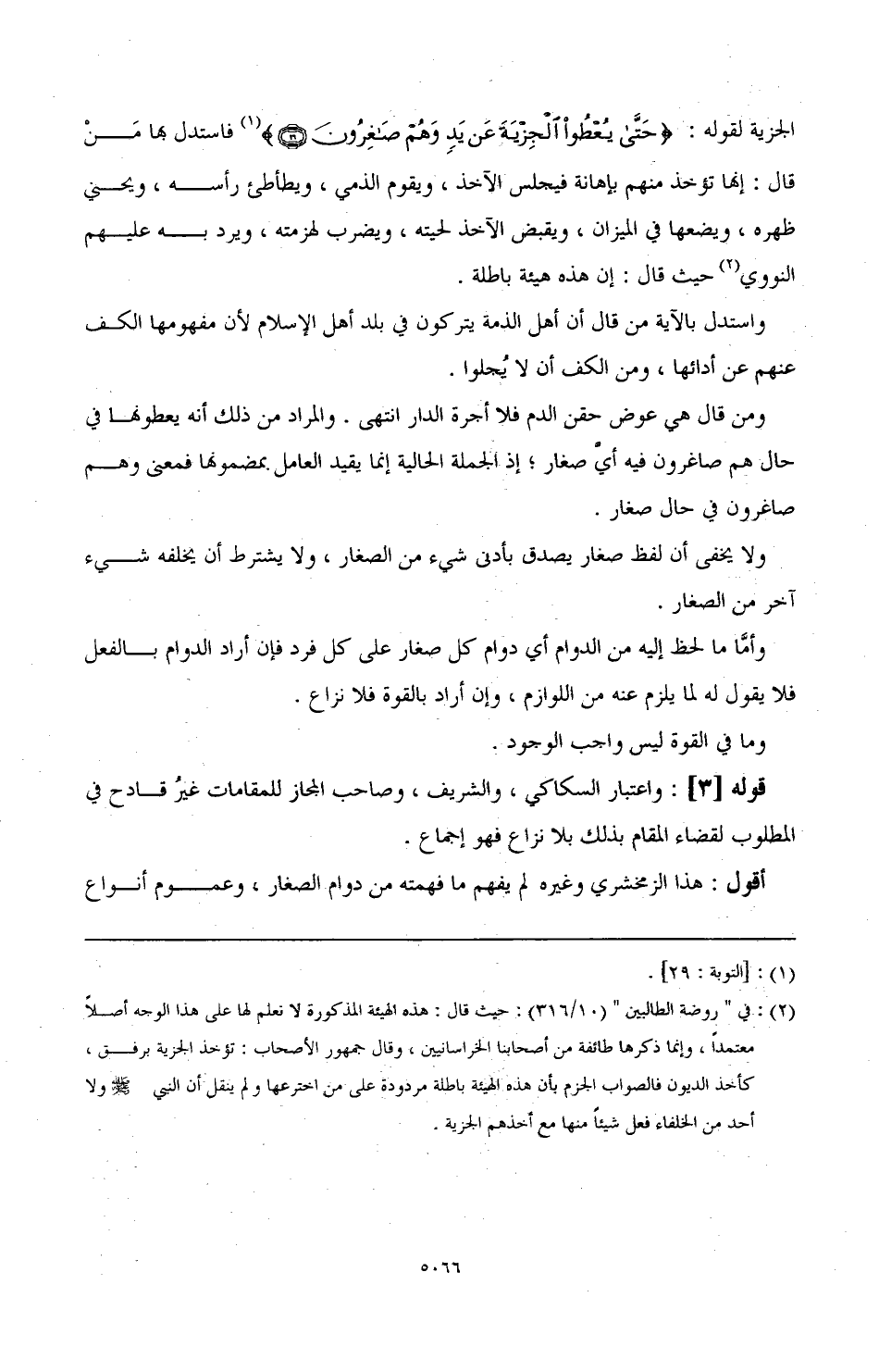 (¬2) في "روضة الطالبين" (10/ 316): حيث قال: هذه الهيئة المذكورة لا نعلم لها على هذا الوجه أصلا معتمدا، وإنما ذكرها طائفة من أصحابنا الخراسانيين، وقال جمهور الأصحاب، تؤخذ الجزية برفق، كأخذ الديون، فالصواب الجزم بأن هذه الهيئة باطلة مردودة على من اخترعها، ولم ينقل أن النبي صَلَّى اللهُ عَلَيْهِ وَسَلَّمَ ولا أحد من الخلفاء فعل شيئا منها مع أخذهم الجزية.