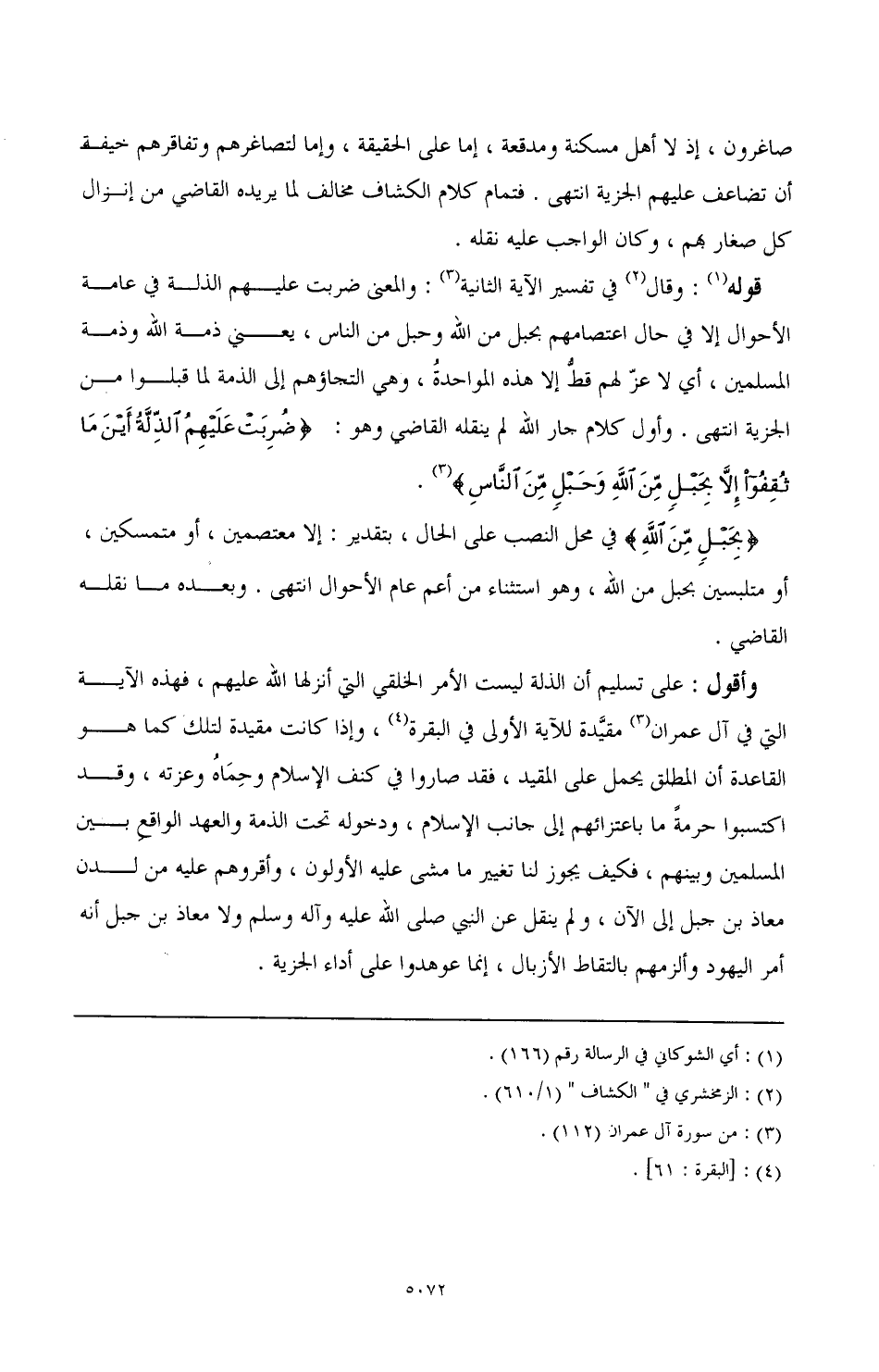 قوله (¬1) وقال (¬2) في تفسير الآية الثانية (¬3): والمعنى ضربت عليم الذلة في عامة الأحوال إلا في حال اعتصامهم بحبل من الله وحبل من الناس، يعني ذمة الله وذمة المسلمين، أي لا عز لهم قط إلا هذه المواحدة، وهي التجاؤهم إلى الذمة لما قبلوا من الجزية انتهى، وأول كلام جار الله لم ينقله القاضي وهو: {ضُرِبَتْ عَلَيْهِمُ الذِّلَّةُ أَيْنَ مَا ثُقِفُوا إِلَّا بِحَبْلٍ مِنَ اللَّهِ وَحَبْلٍ مِنَ النَّاسِ} (¬4).