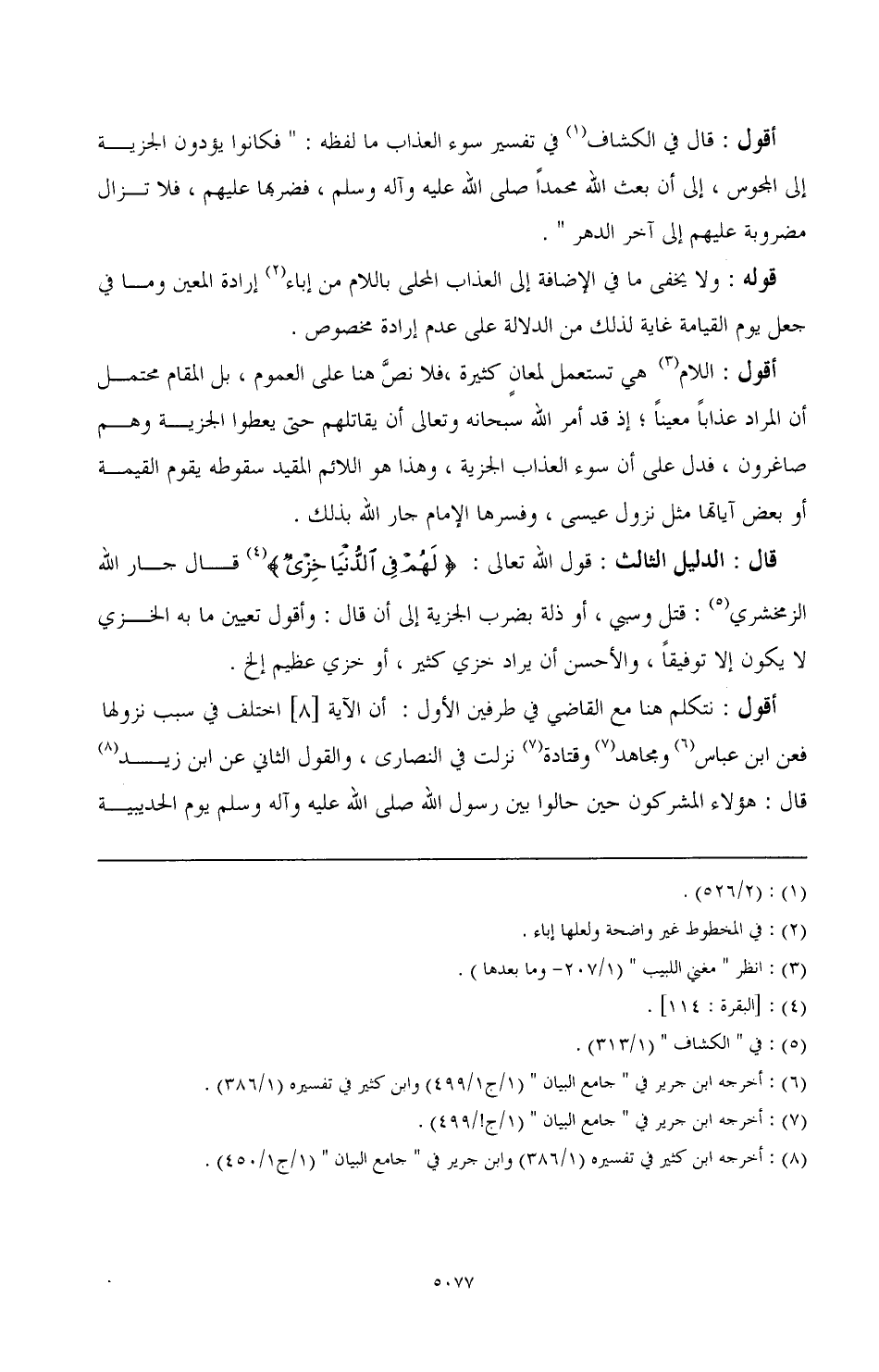 أقول: اللام (¬3) هي تستعمل لمعان كثيرة، فلا نص هنا على العموم، بل المقام محتمل أن المراد عذابا معينا، إذ قد أمر الله سبحانه وتعالى أن يقاتلهم حتى يعطوا الجزية وهم صاغرون، فدل على أن سوء العذاب الجزية، وهذا هو اللائم المقيد سقوطه يقوم القيمة أو بعض آياتها مثل نزول عيسى، وفسرها الإمام جار الله بذلك.