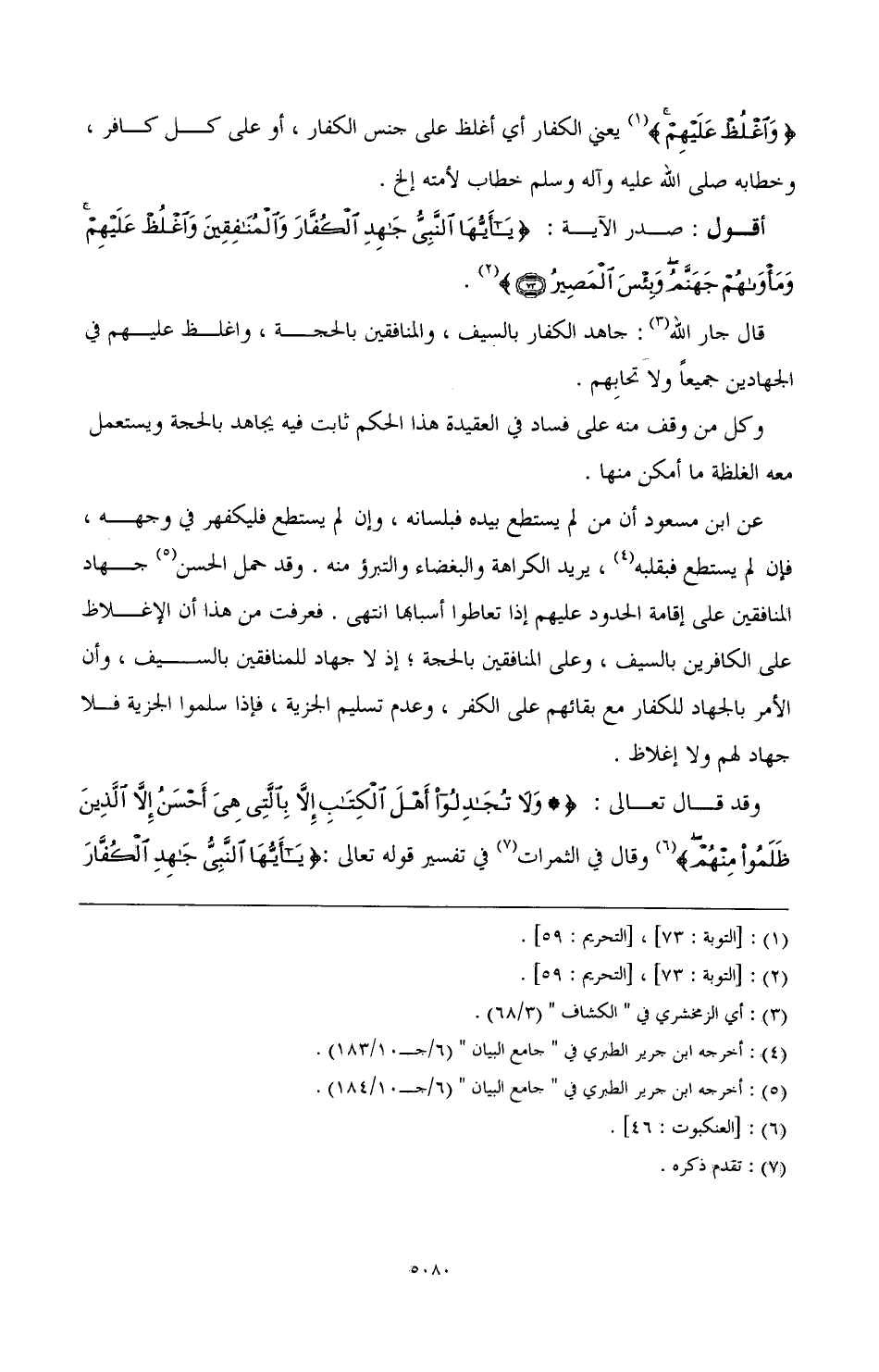أقول: صدر الآية: {يَا أَيُّهَا النَّبِيُّ جَاهِدِ الْكُفَّارَ وَالْمُنَافِقِينَ وَاغْلُظْ عَلَيْهِمْ وَمَأْوَاهُمْ جَهَنَّمُ وَبِئْسَ الْمَصِيرُ} (¬2) قال جار الله (¬3): جاهد الكفار بالسيف، والمنافقين بالحجة، واغلظ عليهم في الجهادين جميعا ولا تحابهم.