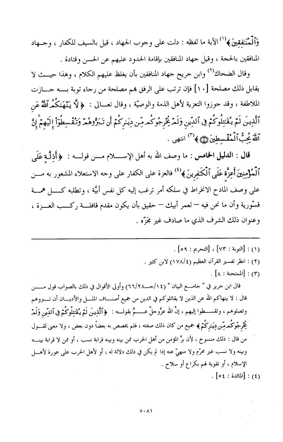 وقال الضحاك (¬1) وابن جريح: جهاد المنافقين بأن يغلظ عليهم الكلام، وهذا حيث لا يقابل ذلك مصلحة [10] فإن ترتب على الرفق بهم مصلحة من رجاء توبة به جازت الملاطفة، وقد جوزوا التعزية لأهل الذمة والوصية، وقال تعالى: {لَا يَنْهَاكُمُ اللَّهُ عَنِ الَّذِينَ لَمْ يُقَاتِلُوكُمْ فِي الدِّينِ وَلَمْ يُخْرِجُوكُمْ مِنْ دِيَارِكُمْ أَنْ تَبَرُّوهُمْ وَتُقْسِطُوا إِلَيْهِمْ إِنَّ اللَّهَ يُحِبُّ الْمُقْسِطِينَ} (¬2) انتهى.