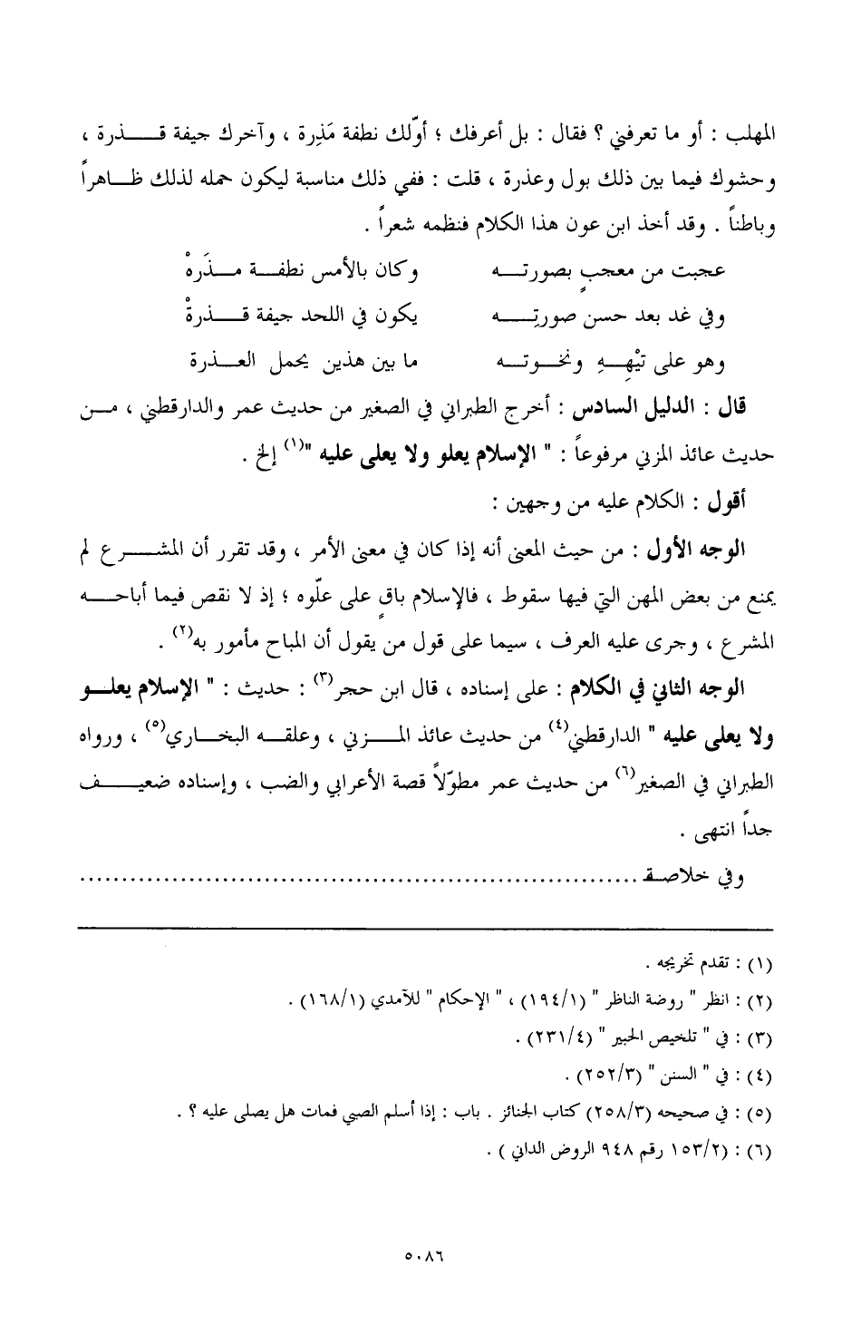 قال: الدليل السادس: أخرج الطبراني في الصغير من حديث عمر والدارقطني، من حديث عائذ المزني مرفوعًا: "الإسلام يعلو ولا يعلى عليه" (¬1) إلخ.