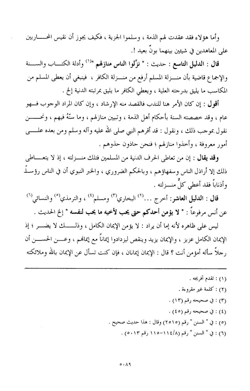 قال: الدليل التاسع: حديث: "نزلوا الناس منازلهم" (¬1) وأدلة الكتاب والسنة والإجماع قاضية بأن منزلة المسلم أرفع من منزلة الكافر، فينبغي أن يعطى المسلم من المكاسب ما يليق بدرجته العلية، ويعطى الكفار ما يليق بمرتبته الدنية إلخ.