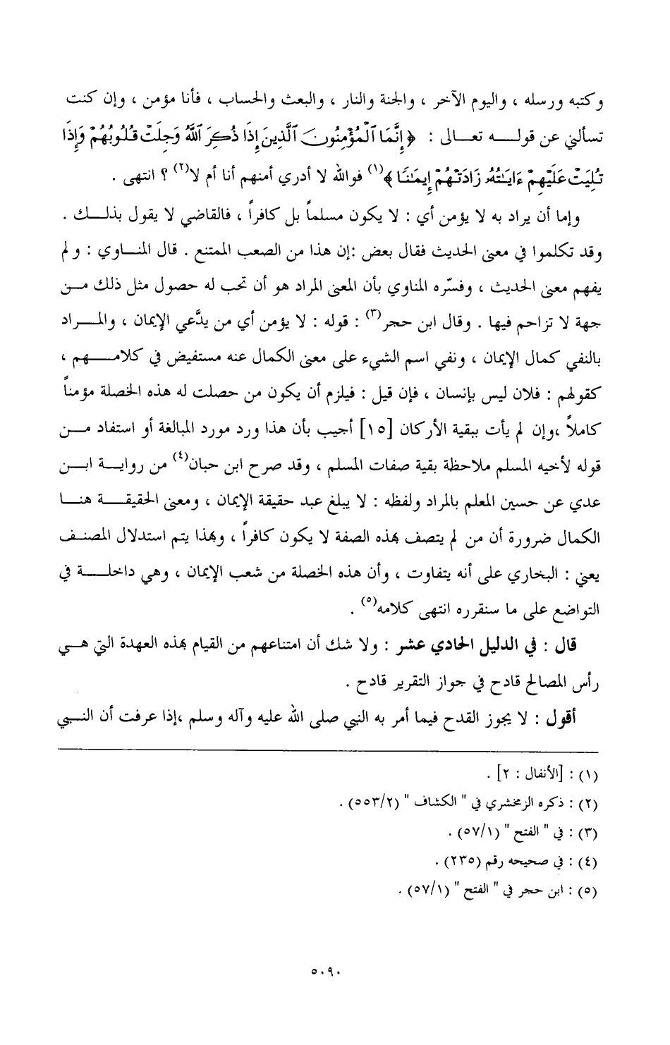 وكتبه ورسله، واليوم الآخر، والجنة النار، والبعث والحساب، فأنا مؤمن، وإن كنت تسألني عن قوله تعالى: {إنما المؤمنون الذين إذا ذكر الله وجلت قلوبهم وإذا تليت عليهم آياته زادتهم إيمانا} (¬1) فوالله لا أدري أمنهم أنا أم لا (¬2) انتهى.