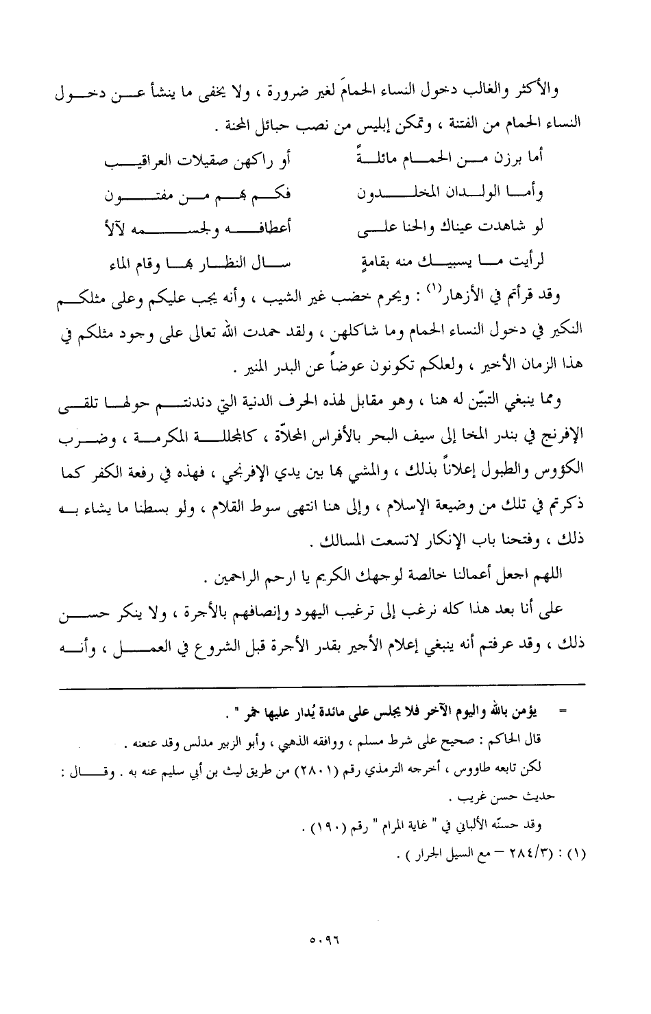 والأكثر والغالب دخول النساء الحمام لغير ضرورة، ولا يخفى ما ينشأ عن دخول الحمام من الفتنة، وتمكن إبليس من نصب حبائل المحنة.