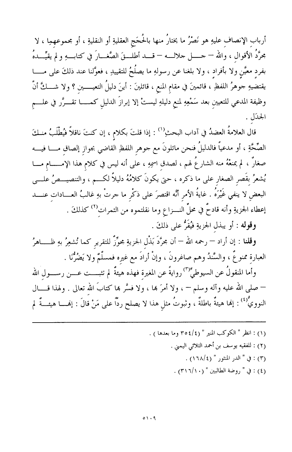 أرباب الإنصاف عليه هو نصر ما يختار منها بالحجج العقلية أو النقلية، أو مجموعهما، لا مجرد الأقوال، والله - جل جلاله - قد أطلق الصغار في كتابه، ولم يقيده بفرد معين ولا بأفراد، ولا بلغنا عن رسوله ما يصلح للتقييد، فعولنا عند ذلك على ما يقتضيه جوهر اللفظ، قائمين في مقام المنع، قائلين: أين دليل التعيين؟ ولا شك أن وظيفة المدعي للتعيين بعد سمعه لمنع دليله ليست إلا إبراز الدليل كما تقرر في علم الجدل.