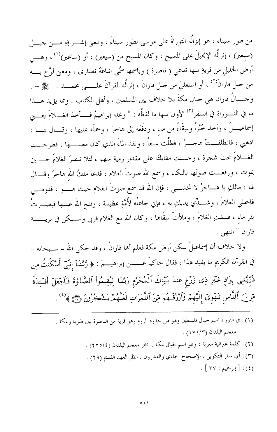 من طور سيناء، هو إنزاله التوراة على موسى بطور سيناء، ومعنى إشراقه من جبل (سيعير)، إنزاله الإنجيل على المسيح، وكان المسيح من (سيعير)، أو (ساعير) (¬1) , وهي أرض الخليل من قرية منها تدعى (ناصرة) وباسمها سمى أتباعه نصارى، ومعنى لوح به من جبل فاران (¬2)، أو استعلن من جبل فاران، إنزاله القرآن على محمد -صَلَّى اللهُ عَلَيْهِ وَسَلَّمَ-. وجبال فاران هي جبال مكة بلا خلاف بين المسلمين، وأهل الكتاب. ومما يؤيد هذا ما في التوراة في السفر (¬3) الأول منها ما لفظه: "وغدا إبراهيم فأخذ الغلام يعني إسماعيل، وأخذ خبزا وسقاء من ماء، ودفعه إلى هاجر، وحمله عليها، وقال لها: اذهبي، فانطلقت هاجر، فظلت سبعا، ونفذ الماء الذي كان معها، فطرحت الغلام تحت شجرة، وجلست مقابلته على مقدار رمية سهم، لئلا تبصر الغلام حين يموت، ورفعت صوتها بالبكاء، وسمع الله صوت الغلام، فدعا ملك الله هاجر وقال لها: ما لك يا هاجر لا تخشي، فإن الله قد سمع صوت الغلام حيث هو، فقومي فاحملي الغلام، وشدي يديك به، فإني جاعله لأمة عظيمة، وفتح الله عينيها فبصرت بئر ماء، فسقت الغلام، وملأت سقاها، وكان الله مع الغلام فربى وسكن في برية فاران" انتهى.