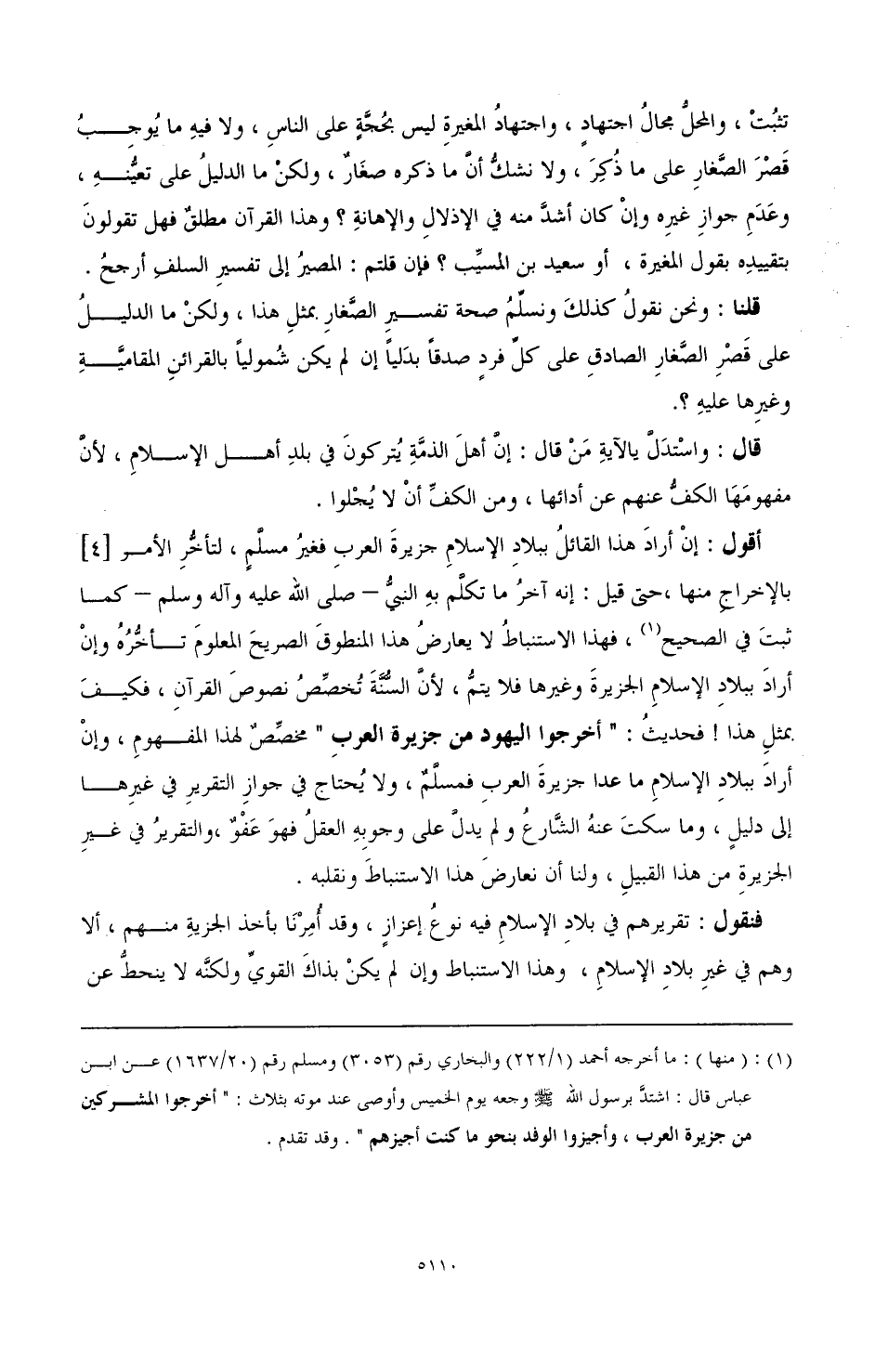 أقول: إن أراد هذا القائل ببلاد الإسلام جزيرة العرب فغير مسلم؛ لتأخر الأمر [4] بالإخراج منها، حتى قيل: إنه آخر ما تكلم به النبي - صَلَّى اللهُ عَلَيْهِ وَآلِهِ وَسَلَّمَ - كما ثبت في الصحيح (¬1)، فهذا الاستنباط لا يعارض هذا المنطوق الصريح المعلوم تأخره وإن أراد ببلاد الإسلام الجزيرة وغيرها فلا يتم؛ لأن السنة تخصص نصوص القرآن، فكيف بمثل هذا! فحديث: "أخرجوا اليهود من جزيرة العرب" مخصص لهذا المفهوم، وإن أراد ببلاد الإسلام ما عدا جزيرة العرب فمسلم، ولا يحتاج في جواز التقرير في غيرها إلى دليل، وما سكت عنه الشارع ولم يدل على وجوبه العقل فهو عفو، والتقرير في غير الجزيرة من هذا القبيل، ولنا أن نعارض هذا الاستنباط ونقلبه.