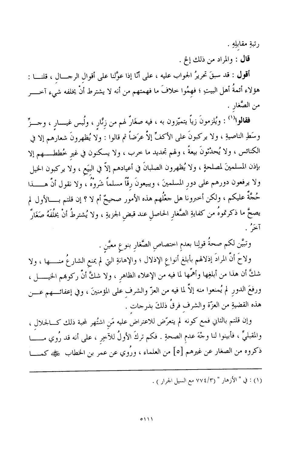 ولاح أن المراد إذلالهم بأبلغ أنواع الإذلال؛ والإهانة التي لم يمنع الشارع منها، ولا شك أن هذا من أبلغها وأهمها لما فيه من الإعلاء الظاهر، ولا شك أن ركوبهم الخيل، ورفع الدور لم يمنعوا منه إلا لما فيه من العز والشرف على المؤمنين، وفي إعفائهم عن هذه القضية من العزة والشرف فرق ذلك بدرجات.