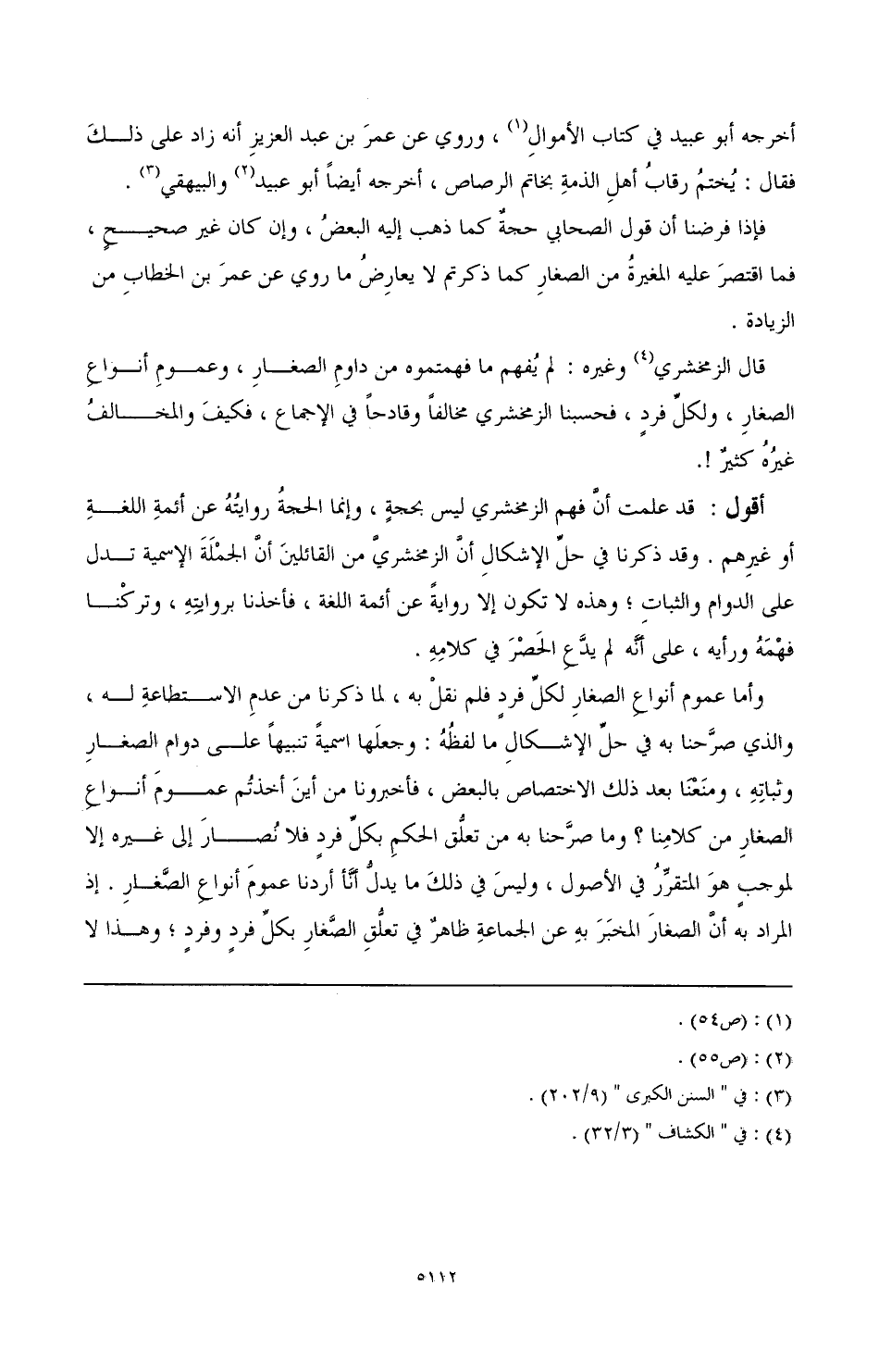 وأما عموم أنواع الصغار لكل فرد فلم نقل به، لما ذكرنا من عدم الاستطاعة له، والذي صرحنا به في حل الإشكال ما لفظه: وجعلها اسمية تنبيهًا على دوام الصغار وثباته، ومنعنا بعد ذلك الاختصاص بالبعض، فأخبرونا من أين أخذتم عموم أنواع الصغار من كلامنا؟ وما صرحنا به من تعلق الحكم بكل فرد فلا نصار إلى غيره إلا لموجب هو المتقرر في الأصول، وليس في ذلك ما يدل أنا أردنا عموم أنواع الصغار. إذ المراد به أن الصغار المخبر به عن الجماعة ظاهر في تعلق الصغار بكل فرد وفرد؛ وهذا لا