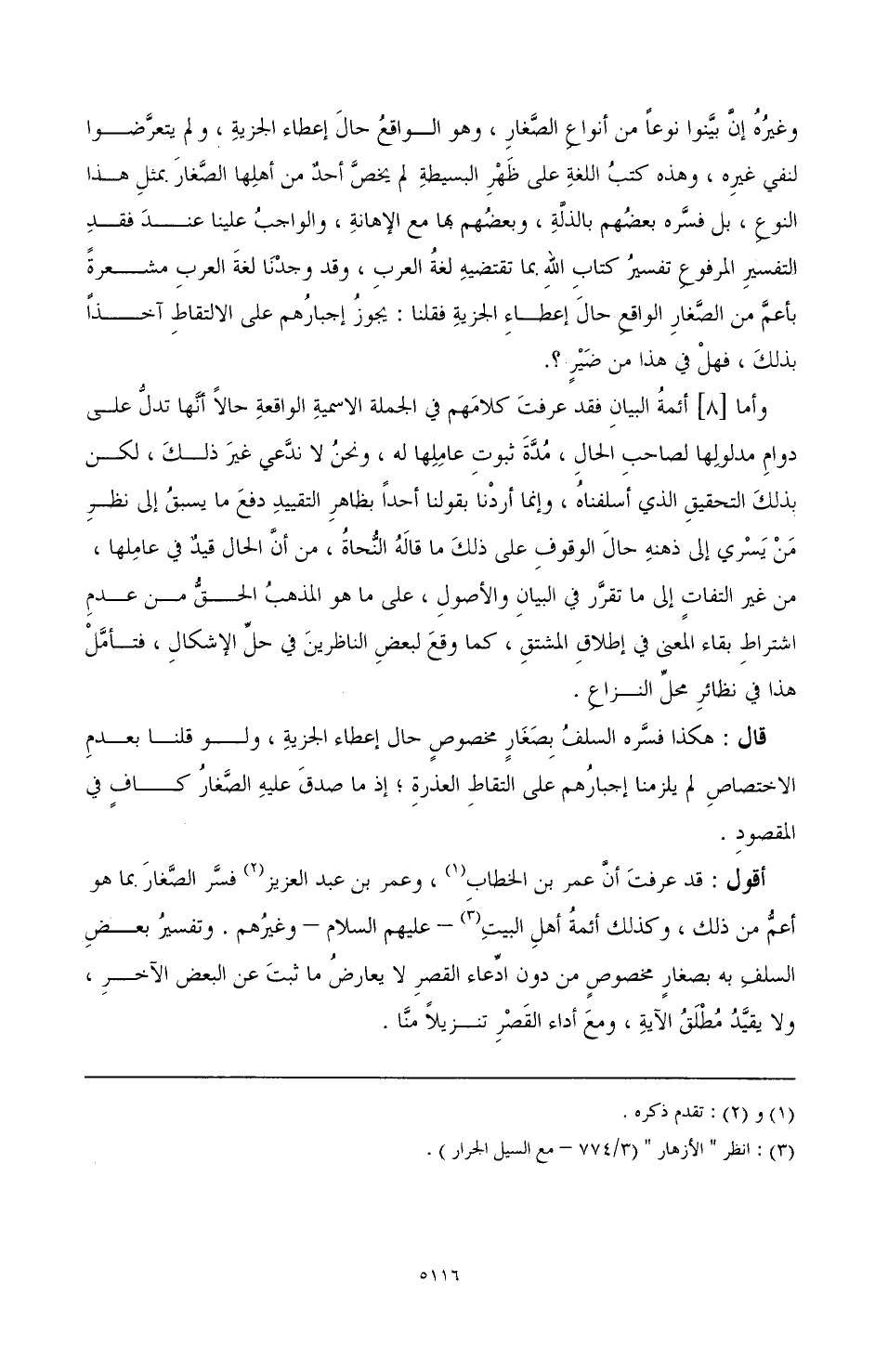 أقول: قد عرفت أن عمر بن الخطاب (¬1)، وعمر بن عبد العزيز (¬2) فسر الصغار بما هو أعم من ذلك، وكذلك أئمة أهل البيت (¬3) - عليهم السلام - وغيرهم. وتفسير بعض السلف به بصغار مخصوص من دون ادعاء القصر لا يعارض ما ثبت عن البعض الآخر، ولا يقيد مطلق الآية، ومع أداء القصر تنزيلًا منا.