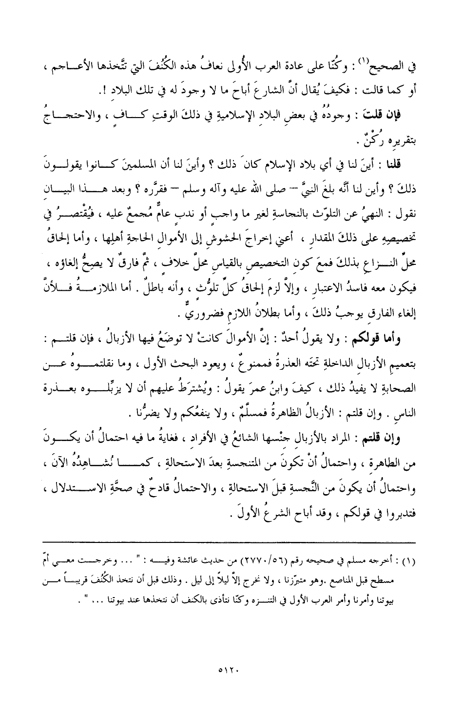 وأما قولكم: ولا يقول أحد: إن الأموال كانت لا توضع فيها الأزبال، فإن قلتم بتعميم الأزبال الداخلة تحته العذرة فممنوع، ويعود البحث الأول، وما نقلتموه عن الصحابة لا يفيد ذلك، كيف وابن عمر يقول: ويشترط عليهم أن لا يزبلوه بعذرة الناس. وإن قلتم: الأزبال الظاهرة فمسلم، ولا ينفعكم ولا يضرنا.